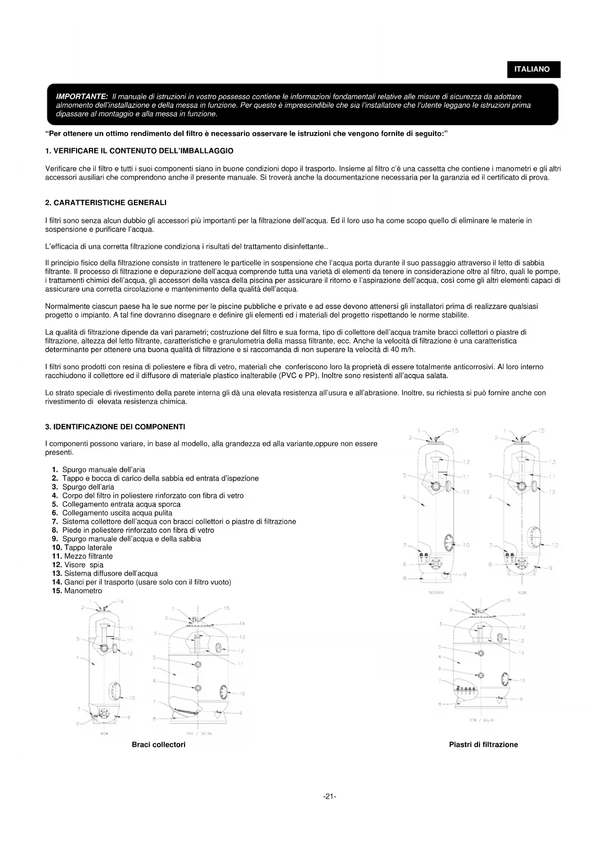 Braci collectori Piastri di filtrazione IMPORTANTE: Il manuale di istruzioni in vostro possesso contiene le informazioni fondamentali relative alle misure di sicurezza da adottare almomento dell’installazione e della messa in funzione. Per questo è imprescindibile che sia l’installatore che l’utente leggano le istruzioni prima dipassare al montaggio e alla messa in funzione.-22- ITALIANO