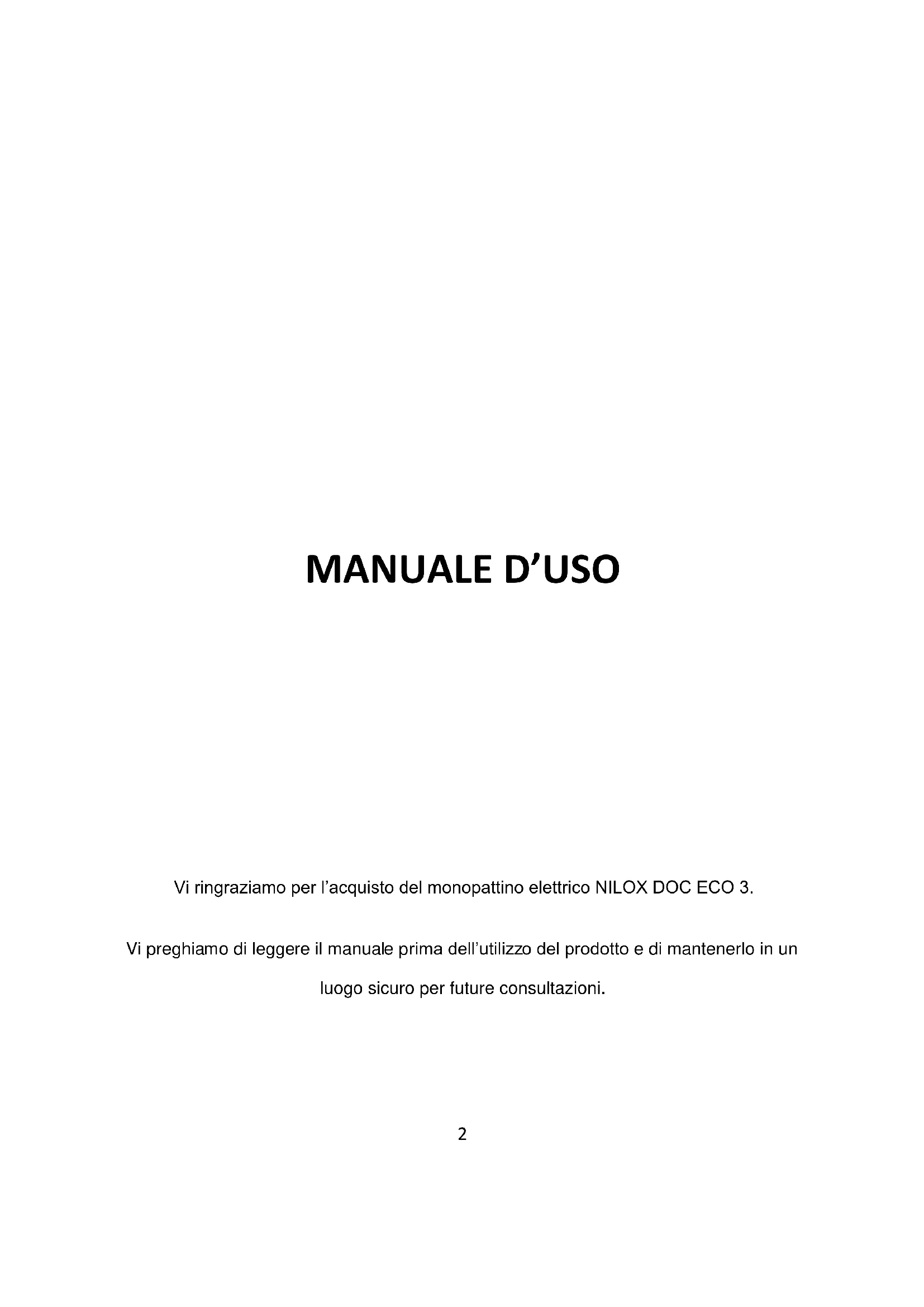 Vi ringraziamo per l’acquisto del monopattino elettrico NILOX DOC ECO 3. Vi preghiamo di leggere il manuale prima dell’utilizzo del prodotto e di mantenerlo in un luogo sicuro per future consultazioni.