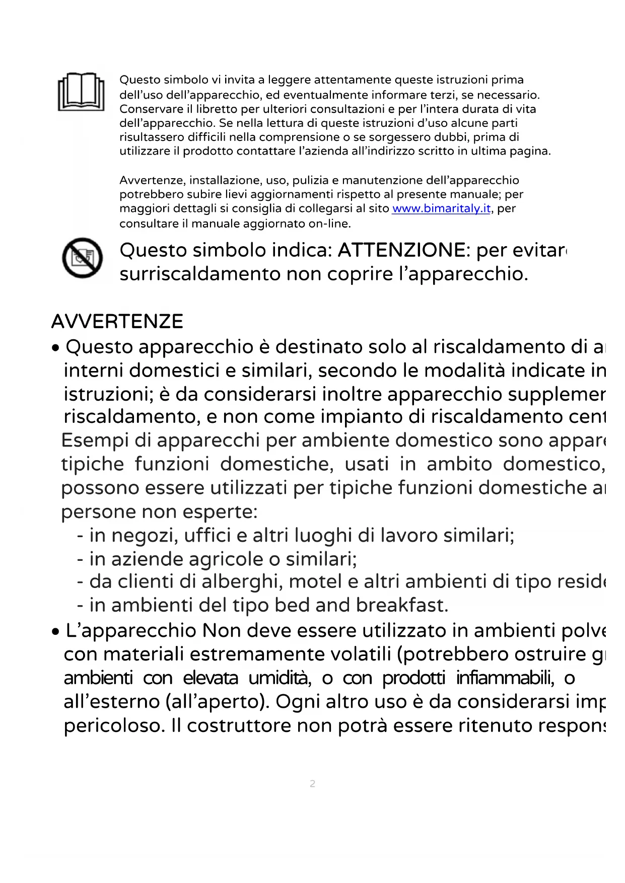 Questo simbolo vi invita a leggere attentamente queste istruzioni prima dell’uso dell’apparecchio, ed eventualmente informare terzi, se necessario. Conservare il libretto per ulteriori consultazioni e per l’intera durata di vita dell’apparecchio. Se nella lettura di queste istruzioni d’uso alcune parti risultassero difficili nella comprensione o se sorgessero dubbi, prima di utilizzare il prodotto contattare l’azienda all’indirizzo scritto in ultima pagina. Avvertenze, installazione, uso, pulizia e manutenzione dell’apparecchio potrebbero subire lievi aggiornamenti rispetto al presente manuale; per maggiori dettagli si consiglia di collegarsi al sito www.bimaritaly.it, per consultare il manuale aggiornato on-line. Questo simbolo indica: ATTENZIONE: per evitare il surriscaldamento non coprire l’apparecchio.3 eventuali danni derivanti da uso improprio, erroneo e irresponsabile e/o da riparazioni effettuate da personale non qualificato. Questa stufa radiante è da considerarsi con elementi visibilmente incandescenti, la cui temperatura è elevata (oltre 650°C): per evitare rischi di scottature, toccare solamente manopole e maniglie, e non toccare altre parti, soprattutto la griglia frontale di protezione perchè scotta. Il sistema di protezione (griglia frontale) di questo apparecchio di riscaldamento è stato concepito per evitare l’accesso diretto agli elementi riscaldanti e deve essere mantenuto nella sua posizione durante l’utilizzo dell’apparecchio di riscaldamento. Il sistema di protezione non garantisce piena protezione a bambini e alle persone inferme. Controllate che l’apparecchio non venga in contatto con l’acqua o altri liquidi. Nel caso dovesse inavvertitamente bagnarsi o immergersi in un liquido, per prima cosa disattivare la presa di corrente spegnendo l’interruttore del quadro elettrico, e solo dopo togliere la spina dalla presa di corrente. Asciugarlo con cura sia spina che la presa di corrente e solo dopo riattivare la corrente alla presa. Re-inserire la spina nella presa di corrente, e poi utilizzare l’apparecchio. In caso di dubbio, rivolgersi a personale professionalmente qualificato. L’apparecchio può essere utilizzato da bambini di età non inferiore a 8 anni e da persone con ridotte capacità fisiche, sensoriali o mentali, o prive di esperienza o della necessaria conoscenza, purchè sotto sorveglianza oppure dopo che le stesse abbiano ricevuto istruzioni relative all’uso sicuro dell’apparecchio e alla comprensione dei pericoli ad esso inerenti. I bambini non devono giocare con l’apparecchio. La pulizia e la manutenzione destinata ad essere effettuata dall’utilizzatore non deve essere effettuata da bambini senza sorveglianza.4 I bambini di età inferiore ai 3 anni dovrebbero essere tenuti a distanza se non continuamente sorvegliati. I bambini di età compresa tra i 3 e gli 8 anni devono solamente accendere/spegnere l’apparecchio purché sia stato posto o installato nella sua normale posizione di funzionamento e che essi ricevano sorveglianza o istruzioni riguardanti l’utilizzo dell’apparecchio in sicurezza e ne capiscano i pericoli. I bambini di età compresa tra i 3 e gli 8 anni non devono inserire la spina, regolare o pulire l’apparecchio né eseguire la manutenzione a cura dell’utilizzatore. ATTENZIONE: Alcune parti del presente prodotto possono diventare molto calde e provocare ustioni. Bisogna prestare particolare attenzione laddove sono presenti bambini e persone vulnerabili. Attenzione: quando si utilizzano apparecchi elettrici, occorre sempre rispettare le precauzioni di sicurezza di base per evitare i rischi di incendio, di scosse elettriche e di lesioni fisiche. La griglia di protezione non fornisce completa protezione a bambini o a persone con ridotte capacità fisiche, sensoriali o mentali. ATTENZIONE: questo apparecchio di riscaldamento non è dotato di un dispositivo di controllo della temperatura ambientale. Non utilizzare in stanze piccole quando queste sono occupate da persone non in grado di lasciare la stanza da soli, a meno che non siano sotto costante sorveglianza. Non usare questo apparecchio in una stanza la cui area di base è inferiore a 4m². Questo apparecchio non deve essere usato in alcun tipo di veicolo o in spazi ristretti (ascensori, camper, automobili, cabine ecc.).5 Non lasciare l’apparecchio senza sorveglianza quando è collegato all'alimentazione. Non spostare l’appareccchio quando è in funzione. Non toccare l’apparecchio con mani o piedi bagnati. Non utilizzare l’apparecchio per asciugare indumenti. Se l’apparecchio non è in funzione togliere la spina dalla presa di corrente. Non lasciare l’apparecchio esposto agli agenti atmosferici (sole, pioggia, ecc.). Dopo l’accensione o lo spegnimento è possibile che l’apparecchio emetta un suono (click) dovuto al riscaldamento o raffreddamento delle parti in metallo; questo non è indice di cattivo funzionamento. In caso di caduta o cattivo funzionamento, scollegare immediatamente il cordone elettrico. Verificare che nessuna parte sia danneggiata, e dopo questi accertamenti accenderlo: in caso di dubbio rivolgersi a personale professionalmente qualificato. Al fine di evitare ogni rischio di scossa elettrica, non immergere mai la spina, il cordone elettrico e l’apparecchio nell’acqua od in nessun altro liquido. Non tirare il cavo di alimentazione o l’apparecchio stesso per disinserire la spina dalla presa di corrente. Se il cavo di alimentazione è danneggiato, esso deve essere sostituito dal costruttore o dal suo servizio assistenza tecnica o comunque da una persona con qualifica similare, in modo da prevenire ogni rischio. Non utilizzare questo apparecchio di riscaldamento con programmatori, temporizzatori o con qualsiasi altro dispositivo che accenda automaticamente l’apparecchio, in quanto esiste il rischio6 di incendio nel caso in cui l’apparecchio sia coperto o posizionato in modo non corretto. Non utilizz