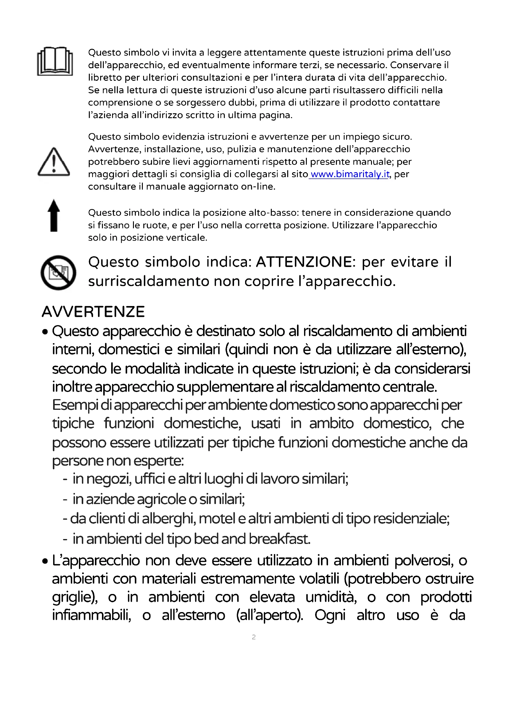 Questo significato evidenza istruzioni e avventenze per un impiego sicuro. Avventenze, INSTALLazione, uso, pulizia e manutenzione dell'apparecchio potrebbero subire lievi aggiornamenti rispetto al presente manuale; per maggiori dettagli si consiglia di collegarsi al site www.bimaritaly.it, per consultare il manuale aggiornato on-line.