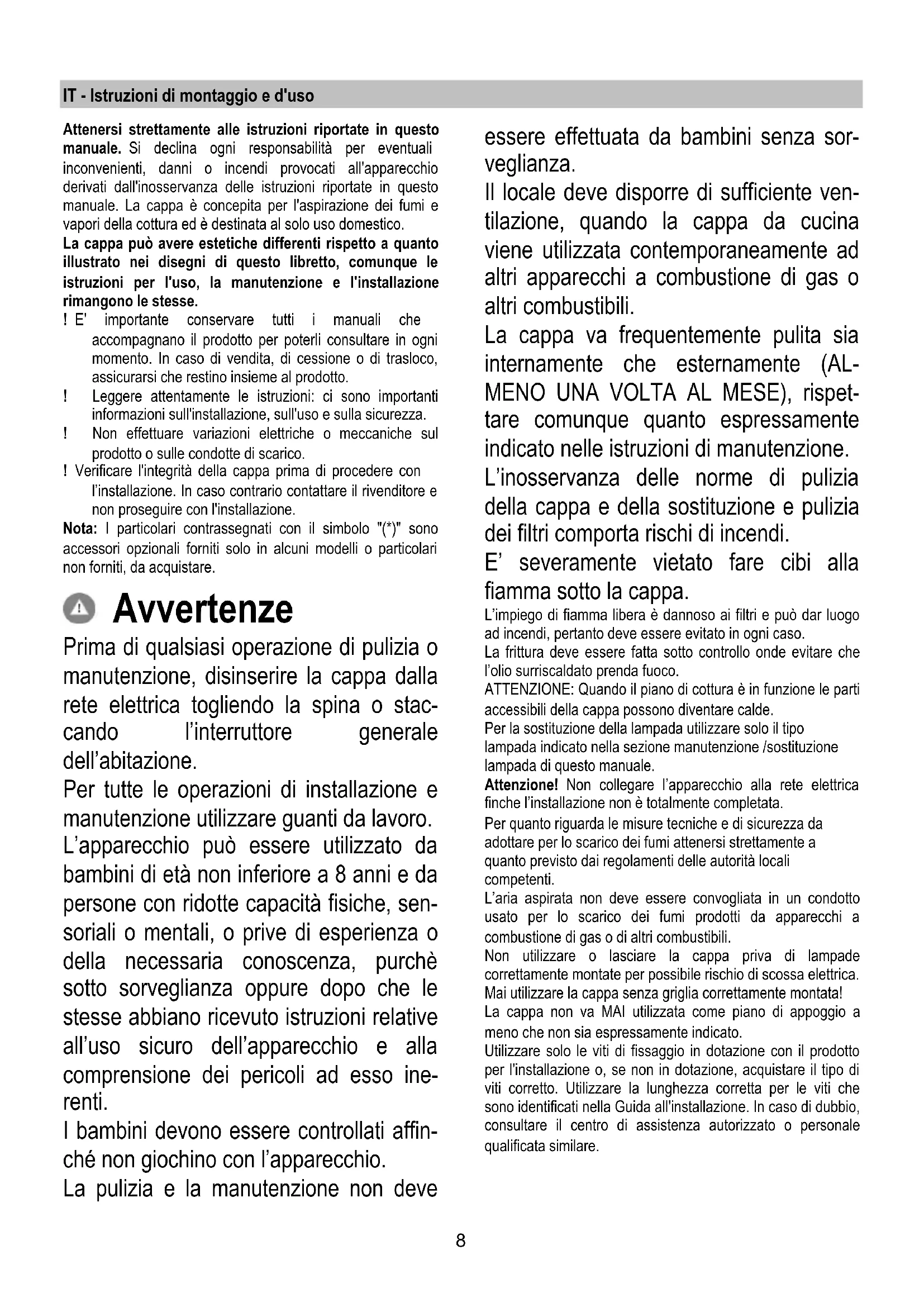 ET Paigaldus- ja kasutusjuhend LT Montavimo ir naudojimosi instrukcija LV Ierkošanas un izmantošanas instrukcija SR Uputstva za montažu i upotrebu SL Navodila za montažo in uporabo HR Uputstva za montažu i za uporabu TR Montaj ve kullanım talimatları ZH 中文-安装和使用说明 AR 8 IT - Istruzioni di montaggio e d'uso Attenersi strettamente alle istruzioni riportate in questo manuale. Si declina ogni responsabilità per eventuali inconvenienti, danni o incendi provocati all'apparecchio derivati dall'inosservanza delle istruzioni riportate in questo manuale. La cappa è concepita per l'aspirazione dei fumi e vapori della cottura ed è destinata al solo uso domestico. La cappa può avere estetiche differenti rispetto a quanto illustrato nei disegni di questo libretto, comunque le istruzioni per l'uso, la manutenzione e l'installazione rimangono le stesse. ! E' importante conservare tutti i manuali che accompagnano il prodotto per poterli consultare in ogni momento. In caso di vendita, di cessione o di trasloco, assicurarsi che restino insieme al prodotto. ! Leggere attentamente le istruzioni: ci sono importanti informazioni sull'installazione, sull'uso e sulla sicurezza. ! Non effettuare variazioni elettriche o meccaniche sul prodotto o sulle condotte di scarico. ! Verificare l'integrità della cappa prima di procedere con l’installazione. In caso contrario contattare il rivenditore e non proseguire con l'installazione. Nota: I particolari contrassegnati con il simbolo "(*)" sono accessori opzionali forniti solo in alcuni modelli o particolari non forniti, da acquistare. Avvertenze Prima di qualsiasi operazione di pulizia o manutenzione, disinserire la cappa dalla rete elettrica togliendo la spina o stac- cando l’interruttore generale dell’abitazione. Per tutte le operazioni di installazione e manutenzione utilizzare guanti da lavoro. L’apparecchio può essere utilizzato da bambini di età non inferiore a 8 anni e da persone con ridotte capacità fisiche, sen- soriali o mentali, o prive di esperienza o della necessaria conoscenza, purchè sotto sorveglianza oppure dopo che le stesse abbiano ricevuto istruzioni relative all’uso sicuro dell’apparecchio e alla comprensione dei pericoli ad esso ine- renti. I bambini devono essere controllati affin- ché non giochino con l’apparecchio. La pulizia e la manutenzione non deve essere effettuata da bambini senza sor- veglianza. Il locale deve disporre di sufficiente ven- tilazione, quando la cappa da cucina viene utilizzata contemporaneamente ad altri apparecchi a combustione di gas o altri combustibili. La cappa va frequentemente pulita sia internamente che esternamente (AL- MENO UNA VOLTA AL MESE), rispet- tare comunque quanto espressamente indicato nelle istruzioni di manutenzione. L’inosservanza delle norme di pulizia della cappa e della sostituzione e pulizia dei filtri comporta rischi di incendi. E’ severamente vietato fare cibi alla fiamma sotto la cappa. L’impiego di fiamma libera è dannoso ai filtri e può dar luogo ad incendi, pertanto deve essere evitato in ogni caso. La frittura deve essere fatta sotto controllo onde evitare che l’olio surriscaldato prenda fuoco. ATTENZIONE: Quando il piano di cottura è in funzione le parti accessibili della cappa possono diventare calde. Per la sostituzione della lampada utilizzare solo il tipo lampada indicato nella sezione manutenzione /sostituzione lampada di questo manuale. Attenzione! Non collegare l’apparecchio alla rete elettrica finche l’installazione non è totalmente completata. Per quanto riguarda le misure tecniche e di sicurezza da adottare per lo scarico dei fumi attenersi strettamente a quanto previsto dai regolamenti delle autorità locali competenti. L’aria aspirata non deve essere convogliata in un condotto usato per lo scarico dei fumi prodotti da apparecchi a combustione di gas o di altri combustibili. Non utilizzare o lasciare la cappa priva di lampade correttamente montate per possibile rischio di scossa elettrica. Mai utilizzare la cappa senza griglia correttamente montata! La cappa non va MAI utilizzata come piano di appoggio a meno che non sia espressamente indicato. Utilizzare solo le viti di fissaggio in dotazione con il prodotto per l'installazione o, se non in dotazione, acquistare il tipo di viti corretto. Utilizzare la lunghezza corretta per le viti che sono identificati nella Guida all'installazione. In caso di dubbio, consultare il centro di assistenza autorizzato o personale qualificata similare.9 ATTENZIONE! La mancata installazione di viti e dispositivi di fissaggio in conformità di queste istruzioni può comportare rischi di natura elettrica. Questo apparecchio è contrassegnato in conformità alla Direttiva Europea 2012/19/EC, Waste Electrical and Electronic Equipment (WEEE). Assicurandosi che questo prodotto sia smaltito in modo corretto, l'utente contribuisce a prevenire le potenziali conseguenze negative per l'ambiente e la salute. Il simbolo sul prodotto o sulla documentazione di accompagnamento indica che questo prodotto non deve essere trattato come rifiuto domestico ma deve essere consegnato presso l'idoneo punto di raccolta per il riciclaggio di apparecchiature elettriche ed elettroniche. Disfarsene seguendo le normative locali per lo smaltimento dei rifiuti. Per ulteriori informazioni sul trattamento, recupero e riciclaggio di questo prodotto, contattare l'idoneo ufficio locale, il servizio di raccolta dei rifiuti domestici o il negozio presso il quale il prodotto è stato acquistato. Apparecchiatura progettata, testata e realizzata nel rispetto delle norme sulla: