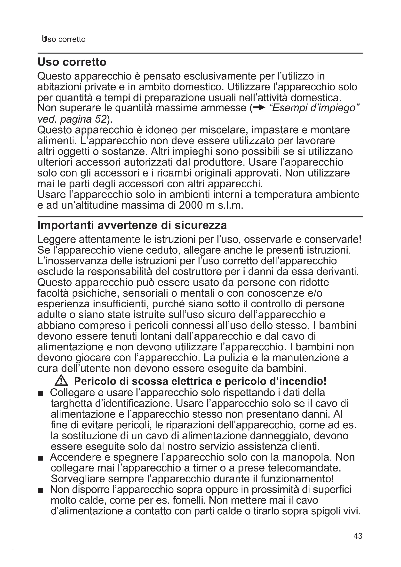 Uso corretto Uso corretto Questo apparecchio è pensato esclusivamente per l’utilizzo in abitazioni private e in ambito domestico. Utilizzare l’apparecchio solo per quantità e tempi di preparazione usuali nell’attività domestica. Non superare le quantità massime ammesse (X “Esempi d’impiego” ved. pagina 52). Questo apparecchio è idoneo per miscelare, impastare e montare alimenti. L’apparecchio non deve essere utilizzato per lavorare altri oggetti o sostanze. Altri impieghi sono possibili se si utilizzano ulteriori accessori autorizzati dal produttore. Usare l’apparecchio solo con gli accessori e i ricambi originali approvati. Non utilizzare mai le parti degli accessori con altri apparecchi. Usare l’apparecchio solo in ambienti interni a temperatura ambiente e ad un’altitudine massima di 2000 m s.l.m. Importanti avvertenze di sicurezza Leggere attentamente le istruzioni per l’uso, osservarle e conservarle! Se l’apparecchio viene ceduto, allegare anche le presenti istruzioni. L’inosservanza delle istruzioni per l’uso corretto dell’apparecchio esclude la responsabilità del costruttore per i danni da essa derivanti. Questo apparecchio può essere usato da persone con ridotte facoltà psichiche, sensoriali o mentali o con conoscenze e/o esperienza insufficienti, purché siano sotto il controllo di persone adulte o siano state istruite sull’uso sicuro dell’apparecchio e abbiano compreso i pericoli connessi all’uso dello stesso. I bambini devono essere tenuti lontani dall’apparecchio e dal cavo di alimentazione e non devono utilizzare l’apparecchio. I bambini non devono giocare con l’apparecchio. La pulizia e la manutenzione a cura dell’utente non devono essere eseguite da bambini. W Pericolo di scossa elettrica e pericolo d’incendio! ■ Collegare e usare l’apparecchio solo rispettando i dati della targhetta d’identificazione. Usare l’apparecchio solo se il cavo di alimentazione e l’apparecchio stesso non presentano danni. Al fine di evitare pericoli, le riparazioni dell’apparecchio, come ad es. la sostituzione di un cavo di alimentazione danneggiato, devono essere eseguite solo dal nostro servizio assistenza clienti. ■ Accendere e spegnere l’apparecchio solo con la manopola. Non collegare mai l’apparecchio a timer o a prese telecomandate. Sorvegliare sempre l’apparecchio durante il funzionamento! ■ Non disporre l’apparecchio sopra oppure in prossimità di superfici molto calde, come per es. fornelli. Non mettere mai il cavo d’alimentazione a contatto con parti calde o tirarlo sopra spigoli vivi.44 it Importanti avvertenze di sicurezza ■ Non immergere mai l’apparecchio base in acqua né lavarlo in lavastoviglie. Non pulire con il vapore. Non usare l’apparecchio con le mani bagnate. ■ L’apparecchio va sempre scollegato dalla corrente elettrica dopo ogni utilizzo, se lasciato incustodito, prima del montaggio, dello smontaggio, della pulizia e in caso di guasti. W Pericolo di lesioni! ■ Prima di sostituire accessori o parti aggiuntive che durante il funzionamento si muovono, l’apparecchio deve essere spento e staccato dalla corrente. Dopo avere spento l’apparecchio, l’ingranaggio continua brevemente a girare. Attendere l’arresto completo dell’ingranaggio. ■ Non spostare il braccio oscillante quando l’apparecchio è in funzione. ■ Mettere in funzione gli utensili soltanto con la ciotola inserita, il coperchio chiuso e i coperchi di sicurezza applicati! Per l’utilizzo degli accessori, montare la ciotola, il coperchio e i coperchi di sicurezza in base alle istruzioni! ■ Durante il funzionamento non introdurre mai le mani nella ciotola o nel pozzetto di riempimento. Non introdurre oggetti (ad es. cucchiai) nella ciotola o nel pozzetto di riempimento. Tenere lontano mani, capelli, abiti e altri utensili dalle parti in rotazione. ■ Non utilizzare mai contemporaneamente utensili e accessori o 2 accessori. Per l’uso degli accessori osservare sia il libretto d’istruzioni accluso sia le presenti istruzioni per l’uso. ■ Usare l’accessorio solo completamente montato. Non assemblare mai l’accessorio sull’apparecchio base. Utilizzare l’accessorio soltanto nell’apposita posizione di lavoro. ■ Tenere le mani lontano dalle lame taglienti e dai bordi dei dischi sminuzzatori. Afferrare i dischi sminuzzatori solo sul bordo! ■ Non toccare a mani nude le lame del frullatore. ■ Non introdurre mai le mani nel frullatore collegato! Non azionare mai il frullatore senza il coperchio. ■ Prestare cautela nel maneggiare lame affilate durante lo svuotamento del contenitore e durante la pulizia. W Pericolo di ustioni! Durante la lavorazione di frullati molto caldi, dal imbuto nel coperchio esce vapore. Introdurre massimo 0,5 litri di liquido molto caldo o che produce schiuma. W Pericolo di soffocamento! Non lasciare che i bambini giochino con il materiale di imballaggio.45