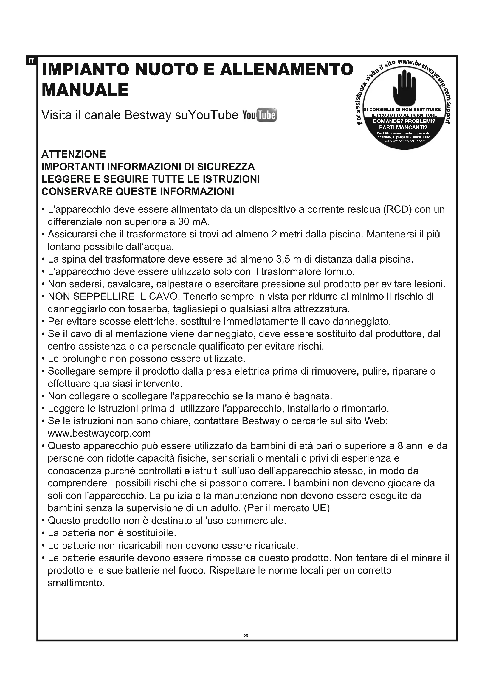 SI CONSIGLIA DI NON RESTITUIRE IL PRODOTTO AL FORNITOREDOMANDE? PROBLEMI?PARTI MANCANTI?Per FAQ, manuali, video o pezzi di ricambio, si prega di visitare il sitobestwaycorp.com/supportVisita il canale Bestway suYouTubeAdatto per piscine interrate o piscine con struttura metallica fuori terra (Dimensioni piscina: lunghezza ≥ 4,57 m, larghezza ≥ 2,44 m, profondità ≥ 1 m) Variazione della temperatura dell’acqua consigliata: 15-35°C Variazione di velocità (approssimativo): Banda di frequenza: 433,92 MHz Potenza massima in radiofrequenza: 8 dBm