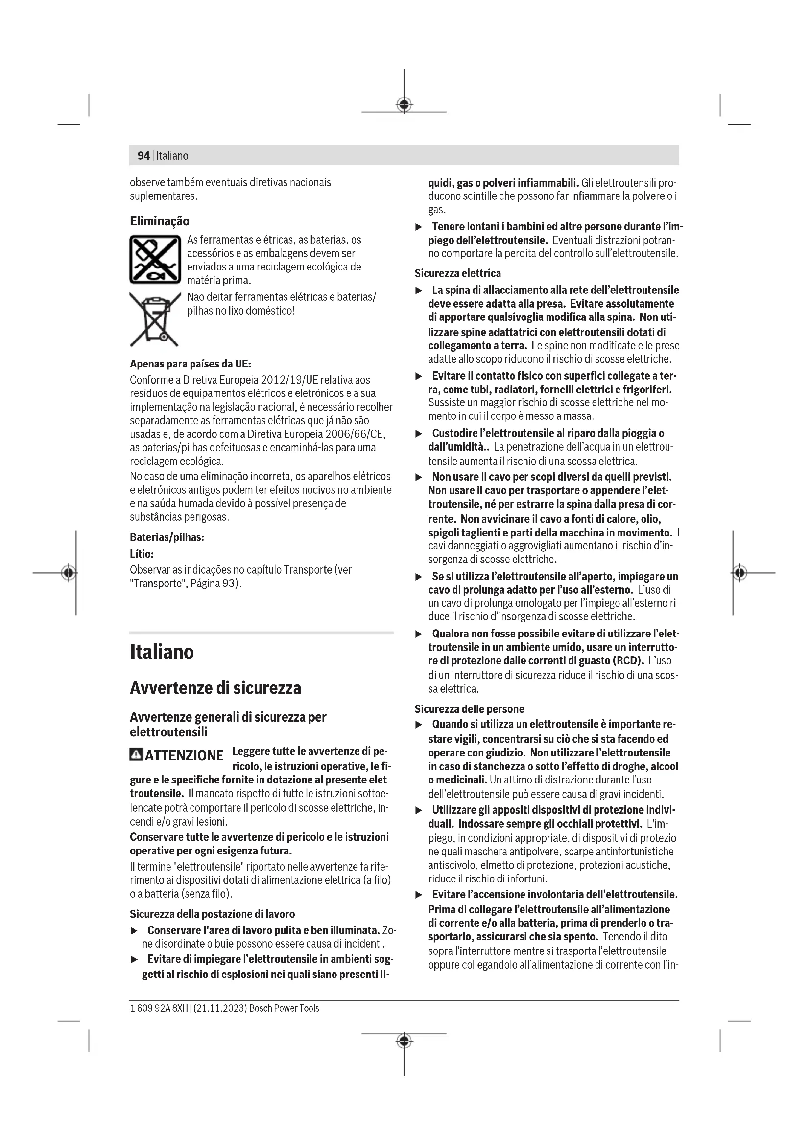 Bluetooth® Low Energy ModuleGCY42 não incluído no volume de fornecimento padrão Funções Connectivity (GWS18V-15 C / GWS18V-15 SC/ GWS18V-15 PSC) Combinado com o Bluetooth® Low Energy ModuleGCY42 (não incluído no material a fornecer padrão) estão disponíveis as seguintes funções de conectividade para a ferramenta elétrica: – Registo e personalização – Verificação do estado, emissão de mensagens de aviso – Informações gerais e ajustes – Gestão Para informações acerca do Bluetooth® Low Energy ModuleGCY42 (não incluído no material a fornecer padrão) leia as respetivas instruções de utilização. A ligação da ferramenta elétrica com a aplicação tem de ser confirmada com a tecla de pré-seleção da velocidade de rotação (39) na interface do utilizador (4). A aplicação solicita essa ação ao ligar. Manutenção e assistência técnica Manutenção e limpeza u A bateria deverá ser retirada antes de todos os trabalhos na ferramenta elétrica (p. ex. manutenção, troca de ferramenta etc.) e antes de transportar ou de armazenar a mesma. Há perigo de ferimentos se o interruptor de ligar/desligar for acionado involuntariamente. u Manter a ferramenta elétrica e as aberturas de ventilação sempre limpas, para trabalhar bem e de forma segura. Os acessórios devem ser armazenados e tratados com cuidado. Serviço pós-venda e aconselhamento O serviço pós-venda responde às suas perguntas a respeito de serviços de reparação e de manutenção do seu produto, assim como das peças sobressalentes. Desenhos explodidos e informações acerca das peças sobressalentes também em: www.bosch-pt.com A nossa equipa de consultores Bosch esclarece com prazer todas as suas dúvidas a respeito dos nossos produtos e acessórios. Indique para todas as questões e encomendas de peças sobressalentes a referência de 10 dígitos de acordo com a placa de caraterísticas do produto. Portugal Robert Bosch LDA Avenida Infante D. Henrique Lotes 2E – 3E 1800 Lisboa Para efetuar o seu pedido online de peças entre na página www.ferramentasbosch.com. Tel.: 21 8500000 Fax: 21 8511096 Encontra outros endereços da assistência técnica em: www.bosch-pt.com/serviceaddresses Transporte As baterias de iões de lítio recomendadas estão sujeitas ao direito de materiais perigosos. As baterias podem ser transportadas na rua pelo utilizador, sem mais obrigações. Na expedição por terceiros (porex: transporte aéreo ou expedição), devem ser observadas as especiais exigências quanto à embalagem e à designação. Neste caso é necessário consultar um especialista de materiais perigosos ao preparar a peça a ser trabalhada. Só enviar baterias se a carcaça não estiver danificada. Colar contactos abertos e embalar a bateria de modo que não possa se movimentar dentro da embalagem. Por favor Bosch Power Tools 1 609 92A 8XH | (21.11.2023)94 | Italiano observe também eventuais diretivas nacionais suplementares. Eliminação As ferramentas elétricas, as baterias, os acessórios e as embalagens devem ser enviados a uma reciclagem ecológica de matéria prima. Não deitar ferramentas elétricas e baterias/ pilhas no lixo doméstico! Apenas para países da UE: Conforme a Diretiva Europeia 2012/19/UE relativa aos resíduos de equipamentos elétricos e eletrónicos e a sua implementação na legislação nacional, é necessário recolher separadamente as ferramentas elétricas que já não são usadas e, de acordo com a Diretiva Europeia 2006/66/CE, as baterias/pilhas defeituosas e encaminhá-las para uma reciclagem ecológica. No caso de uma eliminação incorreta, os aparelhos elétricos e eletrónicos antigos podem ter efeitos nocivos no ambiente e na saúda humada devido à possível presença de substâncias perigosas. Baterias/pilhas: Lítio: Observar as indicações no capítulo Transporte (ver "Transporte", Página93). Italiano Avvertenze di sicurezza Avvertenze generali di sicurezza per elettroutensili ATTENZIONE Leggere tutte le avvertenze di pe- ricolo, le istruzioni operative, le fi- gure e le specifiche fornite in dotazione al presente elet- troutensile. Il mancato rispetto di tutte le istruzioni sottoe- lencate potrà comportare il pericolo di scosse elettriche, in- cendi e/o gravi lesioni. Conservare tutte le avvertenze di pericolo e le istruzioni operative per ogni esigenza futura. Il termine "elettroutensile" riportato nelle avvertenze fa rife- rimento ai dispositivi dotati di alimentazione elettrica (a filo) o a batteria (senza filo). Sicurezza della postazione di lavoro u Conservare l'area di lavoro pulita e ben illuminata. Zo- ne disordinate o buie possono essere causa di incidenti. u Evitare di impiegare l’elettroutensile in ambienti sog- getti al rischio di esplosioni nei quali siano presenti li- quidi, gas o polveri infiammabili. Gli elettroutensili pro- ducono scintille che possono far infiammare la polvere o i gas. u Tenere lontani i bambini ed altre persone durante l’im- piego dell’elettroutensile. Eventuali distrazioni potran- no comportare la perdita del controllo sull’elettroutensile. Sicurezza elettrica u La spina di allacciamento alla rete dell’elettroutensile deve essere adatta alla presa. Evitare assolutamente di apportare qualsivoglia modifica alla spina. Non uti- lizzare spine adattatrici con elettroutensili dotati di collegamento a terra. Le spine non modificate e le prese adatte allo scopo riducono il rischio di scosse elettriche. u Evitare il contatto fisico con superfici collegate a ter- ra, come tubi, radiatori, fornelli elettrici e frigoriferi. Sussiste un maggior rischio di scosse elettriche nel mo- mento in cui il corpo è messo a massa. u Custodire l’elettroutensile al riparo dalla pioggia o dall’umidità.. La penetrazione dell’acqua in un elettrou- tensile aumenta il rischio di una scossa elettrica. u Non usare il cavo per scopi diversi da quelli previsti. Non usare il cavo per trasportare o appendere l’elet- trouten