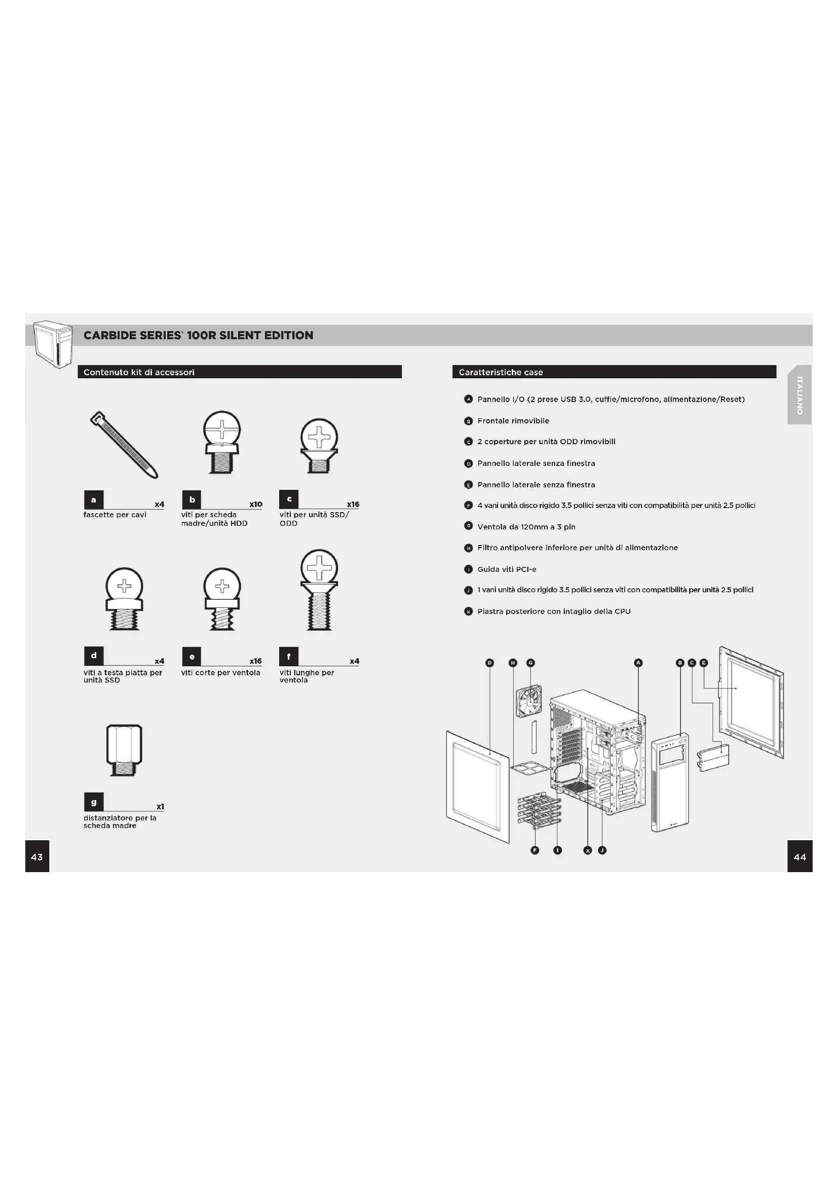 4. Installazione dell’unità di alimentazione (PSU)3. Installazione delle schede PCI-e/PCI2. Installazione della scheda madre1. Rimozione dei pannelli lateraliRimuovere semplicemente le viti e fare scorrere il pannello laterale all’indietro e verso l’esterno. Nota: CORSAIR consiglia di rimuovere e mettere da parte entrambi i pannelli per evitare danni accidentali durante l’assemblaggio del sistema. Entrambi i pannelli laterali sono intercambiabili e dovrebbero essere rimossi per ridurre l’ingombro.Rimuovere le viti e le coperture degli slot corrispondenti.Installare la scheda add-on e fissare con le viti a testa piatta.Posizionare la PSU sul fondo del case, quindi allinearla con i fori del case e fissarla con le viti in dotazione all’unità di alimentazione. 100R STEP2 100R Step 3 100R Silent STEP4 ITALIANOPrima di tutto, installare l’I/O shield della scheda madre. Per istruzioni, vedere il manuale della scheda madre. Allineare la scheda madre ai distanziatori preinstallati.Utilizzare le viti in dotazione per fissare la scheda madre al vano corrispondente.