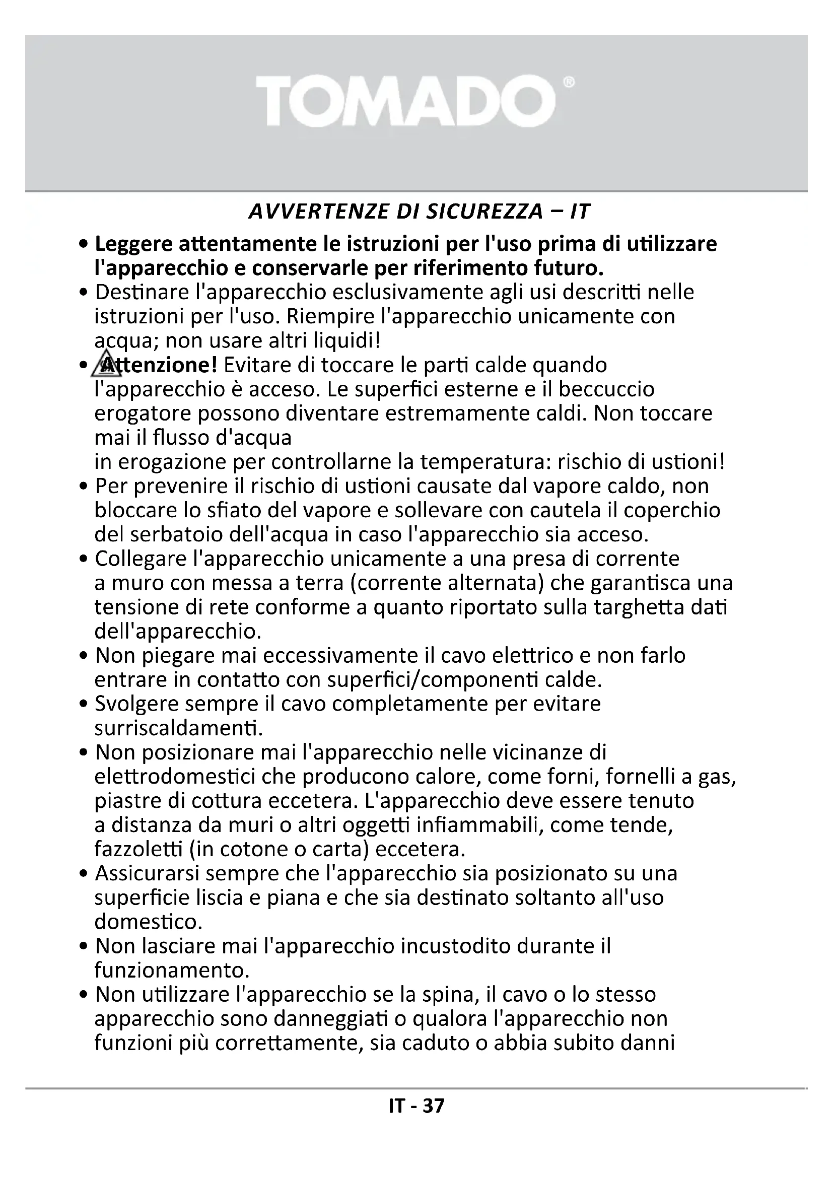 Su questo apparecchio vige una garanzia del produore di 24 mesi. La garanzia è valida soltanto qualora il prodoo sia stato ulizzato in conformità alle istruzioni per l’uso e desnato ai ni a cui è preposto. A un’eventuale richiesta, è inoltre necessario allegare la prova di acquisto originale recante la data di acquisto, il nome del venditore e il numero di arcolo del prodoo. Per ulteriori informazioni sulle condizioni di garanzia: www.tomado.com/support