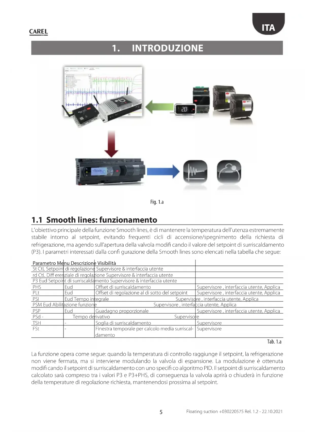 L’obiettivo principale della funzione Smooth lines, è di mantenere la temperatura dell’utenza estremamente stabile intorno al setpoint, evitando frequenti cicli di accensione/spegnimento della richiesta di refrigerazione, ma agendo sull’apertura della valvola modifi cando il valore del setpoint di surriscaldamento (P3). I parametri interessati dalla confi gurazione della Smooth lines sono elencati nella tabella che segue: Parametro Menu Descrizione VisibilitàSt CtL Setpoint di regolazione Supervisore & interfaccia utenterd CtL Diff erenziale di regolazione Supervisore & interfaccia utenteP3 Eud Setpoint di surriscaldamento Supervisore & interfaccia utente PHS Eud Off set di surriscaldamento Supervisore , interfaccia utente, Applica PLt Eud Off set di regolazione al di sotto del setpoint Supervisore , interfaccia utente, Applica PSI Eud Tempo integrale Supervisore , interfaccia utente, ApplicaPSM Eud Abilitazione funzione Supervisore , interfaccia utente, Applica PSP Eud Guadagno proporzionale Supervisore , interfaccia utente, Applica PSd - Tempo derivativo Supervisore TSH - Soglia di surriscaldamento Supervisore FSt - Finestra temporale per calcolo media surriscal-damentoSupervisore Tab. 1.a La funzione opera come segue: quando la temperatura di controllo raggiunge il setpoint, la refrigerazione non viene fermata, ma si interviene modulando la valvola di espansione. La modulazione è ottenuta modifi cando il setpoint di surriscaldamento con uno specifi co algoritmo PID. Il setpoint di surriscaldamento calcolato sarà compreso tra i valori P3 e P3+PHS, di conseguenza la valvola aprirà o chiuderà in funzione della temperature di regolazione richiesta, mantenendosi prossima al setpoint.