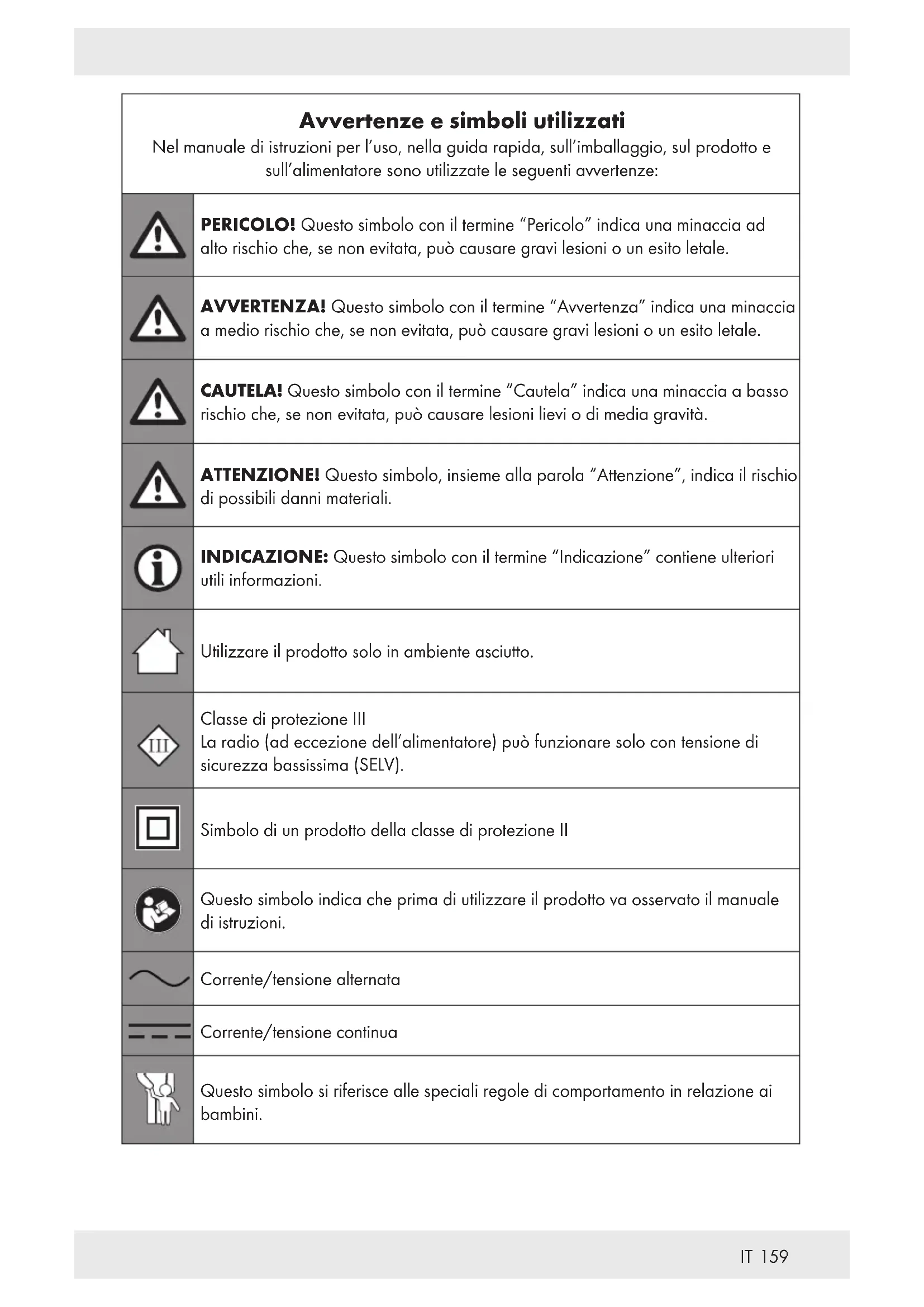 Avvertenze e simboli utilizzati Nel manuale di istruzioni per l’uso, nella guida rapida, sull’imballaggio, sul prodotto e sull’alimentatore sono utilizzate le seguenti avvertenze: PERICOLO! Questo simbolo con il termine “Pericolo” indica una minaccia ad alto rischio che, se non evitata, può causare gravi lesioni o un esito letale. AVVERTENZA! Questo simbolo con il termine “Avvertenza” indica una minaccia a medio rischio che, se non evitata, può causare gravi lesioni o un esito letale. CAUTELA! Questo simbolo con il termine “Cautela” indica una minaccia a basso rischio che, se non evitata, può causare lesioni lievi o di media gravità. ATTENZIONE! Questo simbolo, insieme alla parola “Attenzione”, indica il rischio di possibili danni materiali. INDICAZIONE: Questo simbolo con il termine “Indicazione” contiene ulteriori utili informazioni. Utilizzare il prodotto solo in ambiente asciutto. Classe di protezione III La radio (ad eccezione dell’alimentatore) può funzionare solo con tensione di sicurezza bassissima (SELV). Simbolo di un prodotto della classe di protezione II Questo simbolo indica che prima di utilizzare il prodotto va osservato il manuale di istruzioni. Corrente/tensione alternata Corrente/tensione continua Questo simbolo si riferisce alle speciali regole di comportamento in relazione ai bambini.160