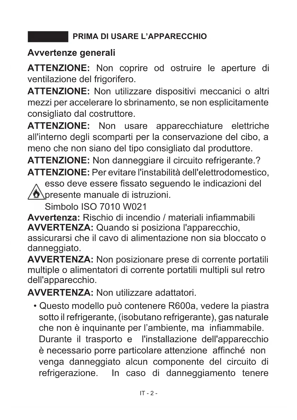Suggerimenti per risparmiare energia .......................................................20 COMPONENTI DELL’ELETTRODOMESTICO E SCOMPARTI .............. 21IT - 2 - Avvertenze generali ATTENZIONE: Non coprire od ostruire le aperture di ventilazione del frigorifero. ATTENZIONE: Non utilizzare dispositivi meccanici o altri mezzi per accelerare lo sbrinamento, se non esplicitamente consigliato dal costruttore. ATTENZIONE: Non usare apparecchiature elettriche all'interno degli scomparti per la conservazione del cibo, a meno che non siano del tipo consigliato dal produttore. ATTENZIONE: Non danneggiare il circuito refrigerante.? ATTENZIONE: Per evitare l'instabilità dell'elettrodomestico, esso deve essere ssato seguendo le indicazioni del presente manuale di istruzioni. Simbolo ISO 7010 W021 Avvertenza: Rischio di incendio / materiali inammabili AVVERTENZA: Quando si posiziona l'apparecchio, assicurarsi che il cavo di alimentazione non sia bloccato o danneggiato. AVVERTENZA: Non posizionare prese di corrente portatili multiple o alimentatori di corrente portatili multipli sul retro dell'apparecchio. AVVERTENZA: Non utilizzare adattatori.
