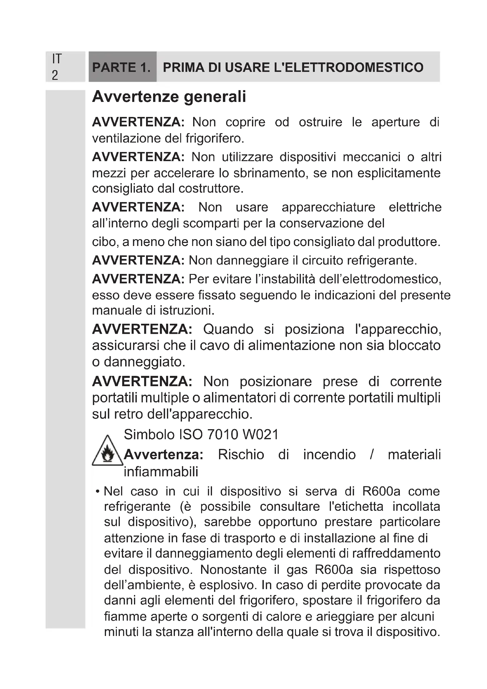 Avvertenze generali AVVERTENZA: Non coprire od ostruire le aperture di ventilazione del frigorifero. AVVERTENZA: Non utilizzare dispositivi meccanici o altri mezzi per accelerare lo sbrinamento, se non esplicitamente consigliato dal costruttore. AVVERTENZA: Non usare apparecchiature elettriche all’interno degli scomparti per la conservazione del cibo, a meno che non siano del tipo consigliato dal produttore. AVVERTENZA: Non danneggiare il circuito refrigerante. AVVERTENZA: Per evitare l’instabilità dell’elettrodomestico, esso deve essere ssato seguendo le indicazioni del presente manuale di istruzioni. AVVERTENZA: Quando si posiziona l'apparecchio, assicurarsi che il cavo di alimentazione non sia bloccato o danneggiato. AVVERTENZA: Non posizionare prese di corrente portatili multiple o alimentatori di corrente portatili multipli sul retro dell'apparecchio. Simbolo ISO 7010 W021 Avvertenza: Rischio di incendio / materiali inammabili