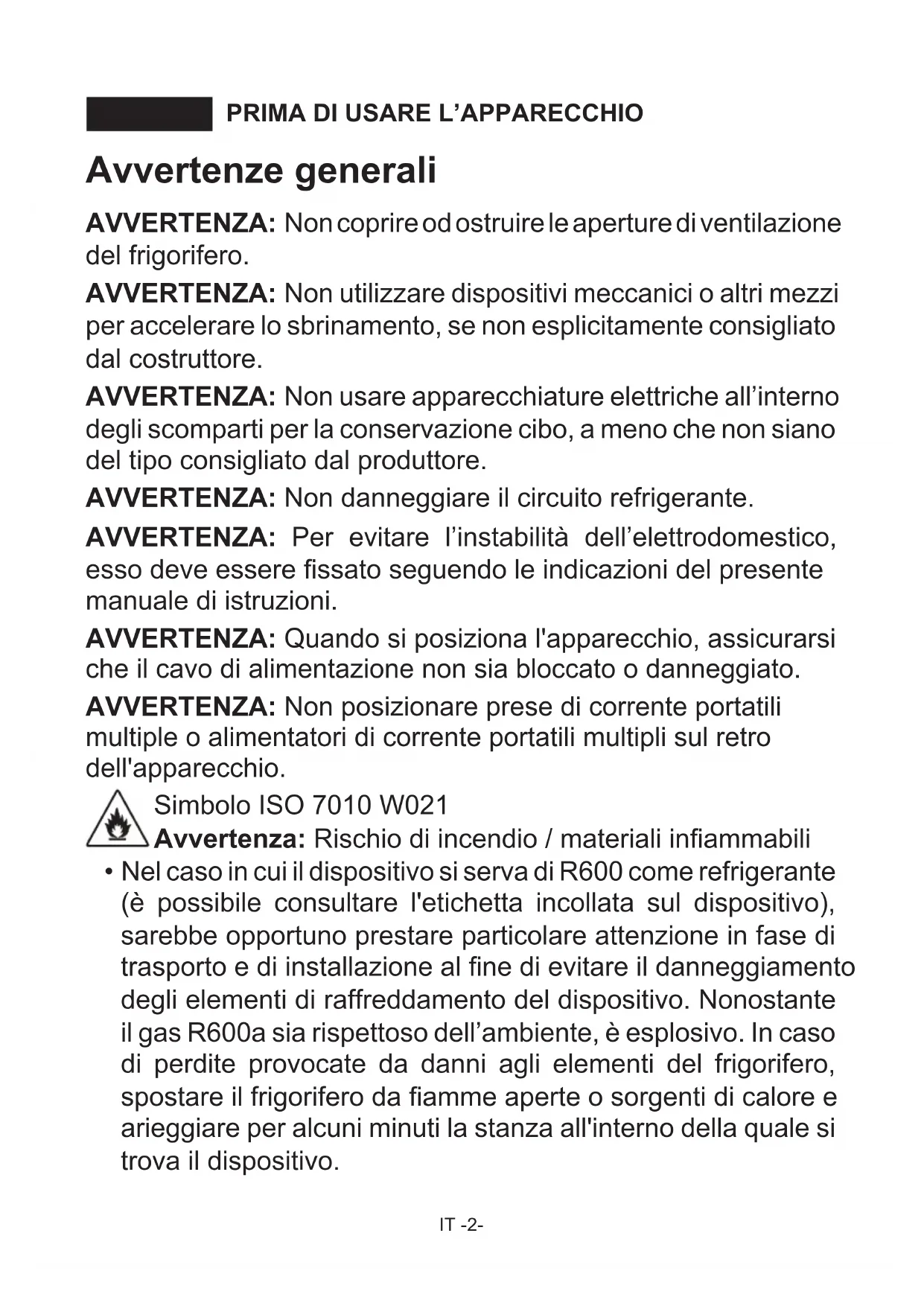 COMPONENTI DELL’ELETTRODOMESTICO E SCOMPARTI 14IT -2- PRIMA DI USARE L’APPARECCHIOPARTE 1. Avvertenze generali AVVERTENZA: Non coprire od ostruire le aperture di ventilazione del frigorifero. AVVERTENZA: Non utilizzare dispositivi meccanici o altri mezzi per accelerare lo sbrinamento, se non esplicitamente consigliato dal costruttore. AVVERTENZA: Non usare apparecchiature elettriche all’interno degli scomparti per la conservazione cibo, a meno che non siano del tipo consigliato dal produttore. AVVERTENZA: Non danneggiare il circuito refrigerante. AVVERTENZA: Per evitare l’instabilità dell’elettrodomestico, esso deve essere ssato seguendo le indicazioni del presente manuale di istruzioni. AVVERTENZA: Quando si posiziona l'apparecchio, assicurarsi che il cavo di alimentazione non sia bloccato o danneggiato. AVVERTENZA: Non posizionare prese di corrente portatili multiple o alimentatori di corrente portatili multipli sul retro dell'apparecchio. Simbolo ISO 7010 W021 Avvertenza: Rischio di incendio / materiali inammabili