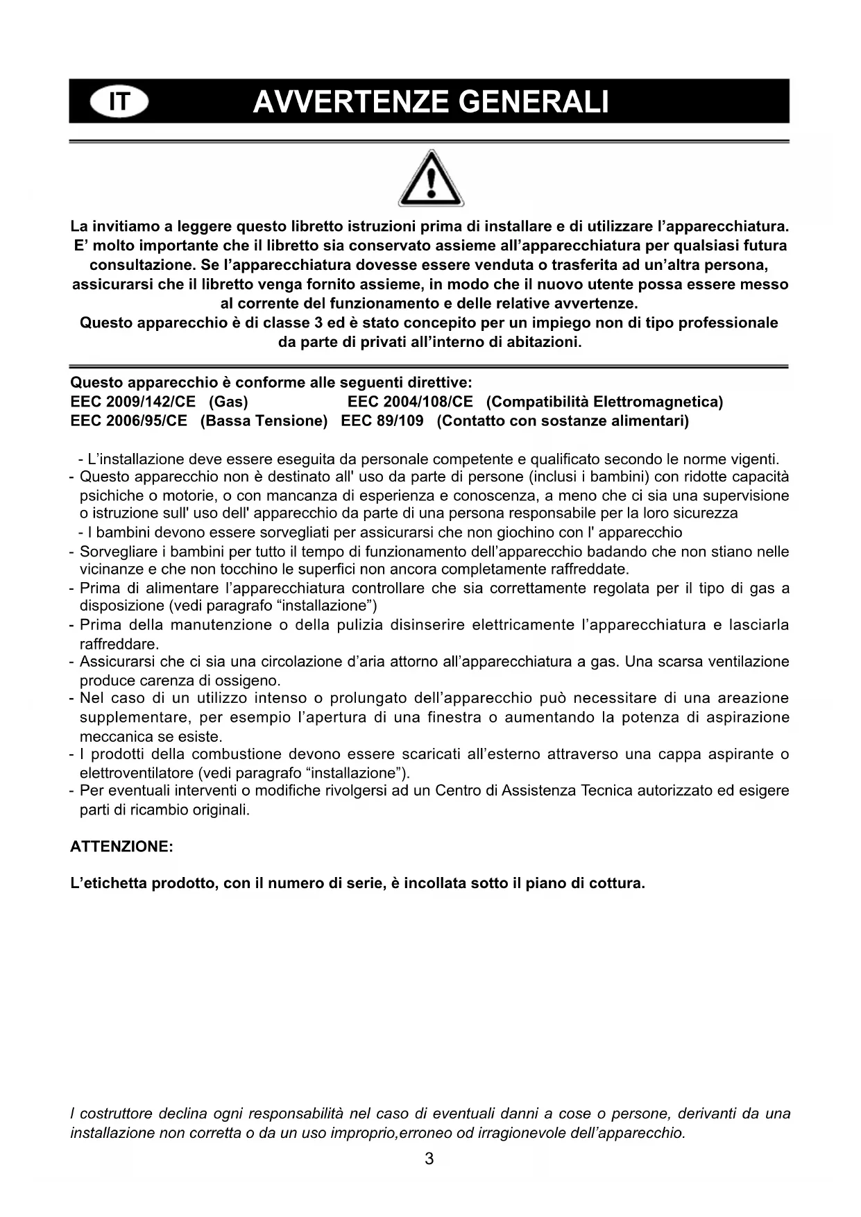 l costruttore declina ogni responsabilità nel caso di eventuali danni a cose o persone, derivanti da una installazione non corretta o da un uso improprio,erroneo od irragionevole dell’apparecchio. La invitiamo a leggere questo libretto istruzioni prima di installare e di utilizzare l’apparecchiatura. E’ molto importante che il libretto sia conservato assieme all’apparecchiatura per qualsiasi futura consultazione. Se l’apparecchiatura dovesse essere venduta o trasferita ad un’altra persona, assicurarsi che il libretto venga fornito assieme, in modo che il nuovo utente possa essere messo al corrente del funzionamento e delle relative avvertenze. Questo apparecchio è di classe 3 ed è stato concepito per un impiego non di tipo professionale da parte di privati all’interno di abitazioni. Questo apparecchio è conforme alle seguenti direttive: EEC 2009/142/CE (Gas) EEC 2004/108/CE (Compatibilità Elettromagnetica) EEC 2006/95/CE (Bassa Tensione) EEC 89/109 (Contatto con sostanze alimentari) - L’installazione deve essere eseguita da personale competente e qualificato secondo le norme vigenti. - Questo apparecchio non è destinato all' uso da parte di persone (inclusi i bambini) con ridotte capacità psichiche o motorie, o con mancanza di esperienza e conoscenza, a meno che ci sia una supervisione o istruzione sull' uso dell' apparecchio da parte di una persona responsabile per la loro sicurezza - I bambini devono essere sorvegliati per assicurarsi che non giochino con l' apparecchio - Sorvegliare i bambini per tutto il tempo di funzionamento dell’apparecchio badando che non stiano nelle vicinanze e che non tocchino le superfici non ancora completamente raffreddate. - Prima di alimentare l’apparecchiatura controllare che sia correttamente regolata per il tipo di gas a disposizione (vedi paragrafo “installazione”) - Prima della manutenzione o della pulizia disinserire elettricamente l’apparecchiatura e lasciarla raffreddare. - Assicurarsi che ci sia una circolazione d’aria attorno all’apparecchiatura a gas. Una scarsa ventilazione produce carenza di ossigeno. - Nel caso di un utilizzo intenso o prolungato dell’apparecchio può necessitare di una areazione supplementare, per esempio l’apertura di una finestra o aumentando la potenza di aspirazione meccanica se esiste. - I prodotti della combustione devono essere scaricati all’esterno attraverso una cappa aspirante o elettroventilatore (vedi paragrafo “installazione”). - Per eventuali interventi o modifiche rivolgersi ad un Centro di Assistenza Tecnica autorizzato ed esigere parti di ricambio originali. ATTENZIONE: L’etichetta prodotto, con il numero di serie, è incollata sotto il piano di cottura.