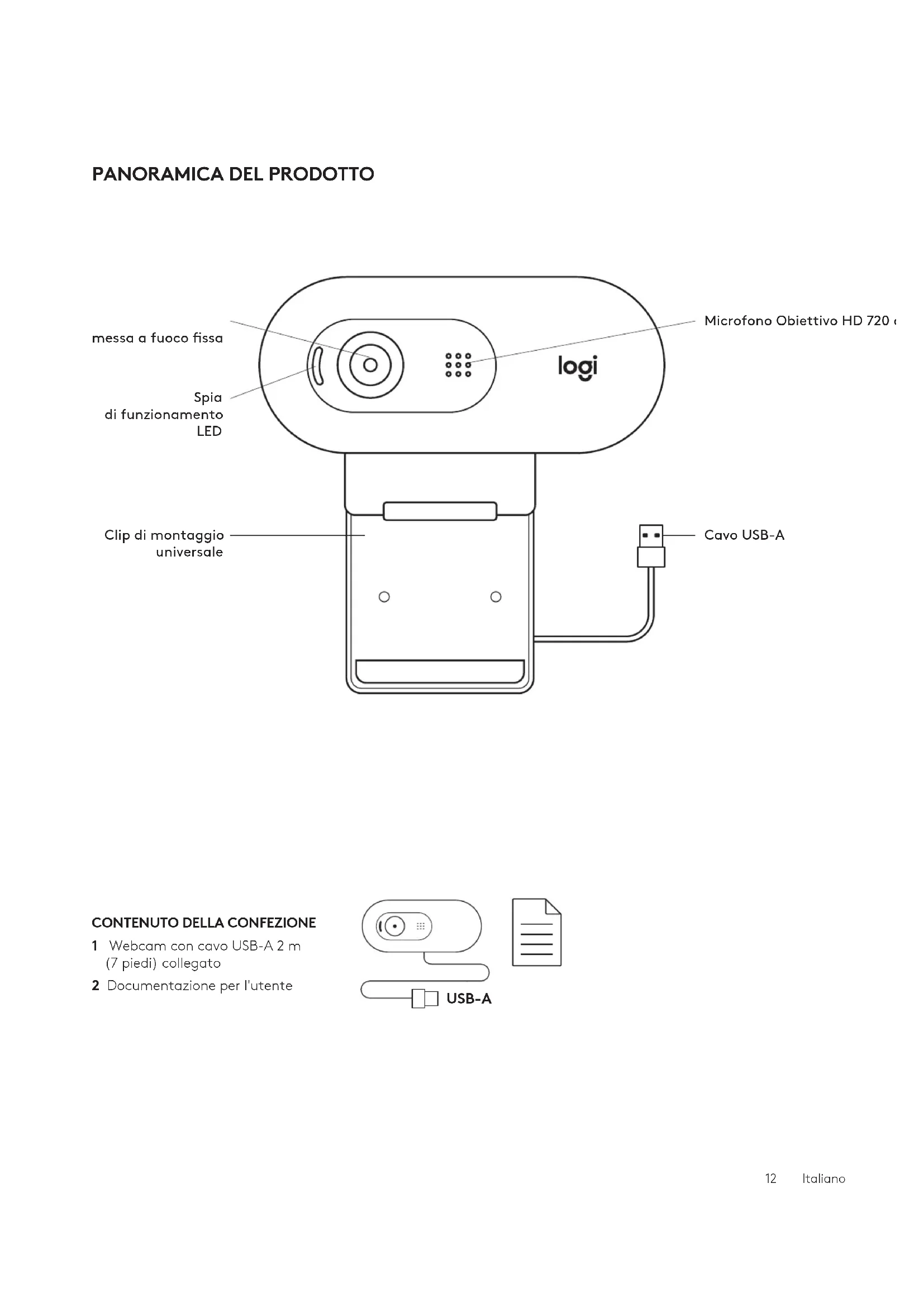 1 Webcam con cavo USB-A 2 m (7piedi) collegato 2 Documentazione per l'utente 12 ItalianoCONFIGURAZIONE DELLA WEBCAM 1 Posiziona la tua webcam su un computer, laptop omonitor nella posizione o angolazione desiderata.