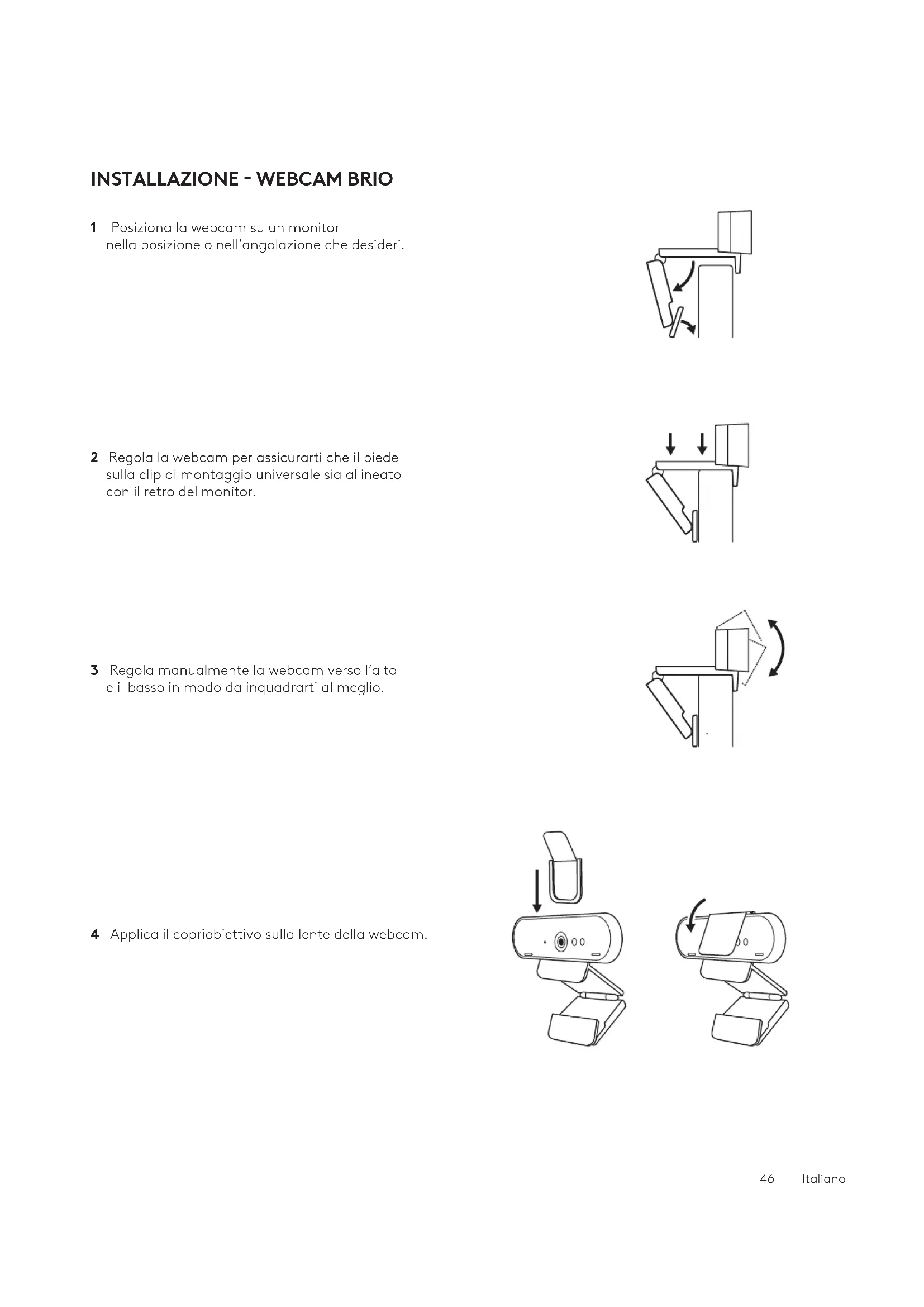 45 ItalianoINSTALLAZIONE - WEBCAM BRIO 1 Posiziona la webcam su un monitor nellaposizione o nell’angolazione che desideri. 2 Regola la webcam per assicurarti che il piede sulla clip di montaggio universale sia allineato con il retro del monitor. 3 Regola manualmente la webcam verso l’alto eilbasso in modo da inquadrarti al meglio. 4 Applica il copriobiettivo sulla lente della webcam. 46ItalianoINSTALLAZIONE - KIT PER TENERE IN ORDINE IL CAVO USB-C 1 Pulisci la supercie. Stacca la protezione delnastro adesivo. 2 Premi con forza l’anello sul tavolo per alcuni secondi. 47ItalianoINSTALLAZIONE - OPZIONI STAFFA DI MONTAGGIO Opzione 1 Fissa Logi Dock sul tavolo usando le2 viti incluse. Opzione 2 Fissa Logi Dock sul tavolo con ilnastro VHB applicando il nastro alla parte inferiore della staa. Opzione 3 Fissa Logi Dock al tavolo con lucchetto Kensington.*