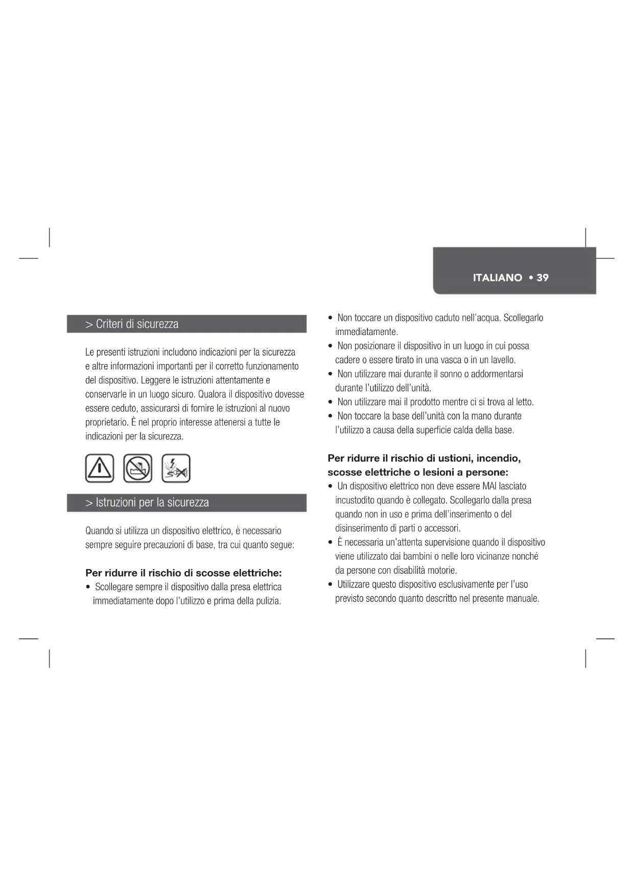 - Expiração da garantia.ITALIANO • 39 > Criteri di sicurezza Le presenti istruzioni includono indicazioni per la sicurezza e altre informazioni importanti per il corretto funzionamento del dispositivo. Leggere le istruzioni attentamente e conservarle in un luogo sicuro. Qualora il dispositivo dovesse essere ceduto, assicurarsi di fornire le istruzioni al nuovo proprietario. È nel proprio interesse attenersi a tutte le indicazioni per la sicurezza. > Istruzioni per la sicurezza Quando si utilizza un dispositivo elettrico, è necessario sempre seguire precauzioni di base, tra cui quanto segue: Per ridurre il rischio di scosse elettriche: