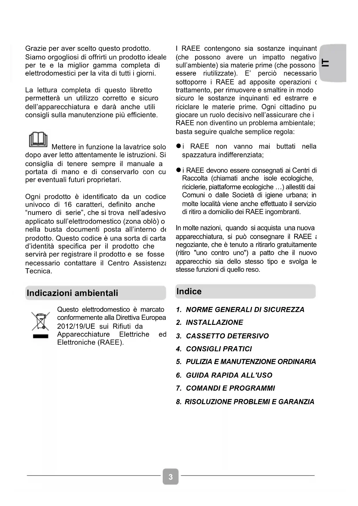 Grazie per aver scelto questo prodotto. Siamo orgogliosi di offrirti un prodotto ideale per te e la miglior gamma completa di elettrodomestici per la vita di tutti i giorni. La lettura completa di questo libretto permetterà un utilizzo corretto e sicuro dell’apparecchiatura e darà anche utili consigli sulla manutenzione più efficiente. Mettere in funzione la lavatrice solo dopo aver letto attentamente le istruzioni. Si consiglia di tenere sempre il manuale a portata di mano e di conservarlo con cura per eventuali futuri proprietari. Ogni prodotto è identificato da un codice univoco di 16 caratteri, definito anche “numero di serie”, che si trova nell’adesivo applicato sull’elettrodomestico (zona oblò) o nella busta documenti posta all’interno del prodotto. Questo codice è una sorta di carta d’identità specifica per il prodotto che servirà per registrare il prodotto e se fosse necessario contattare il Centro Assistenza Tecnica.