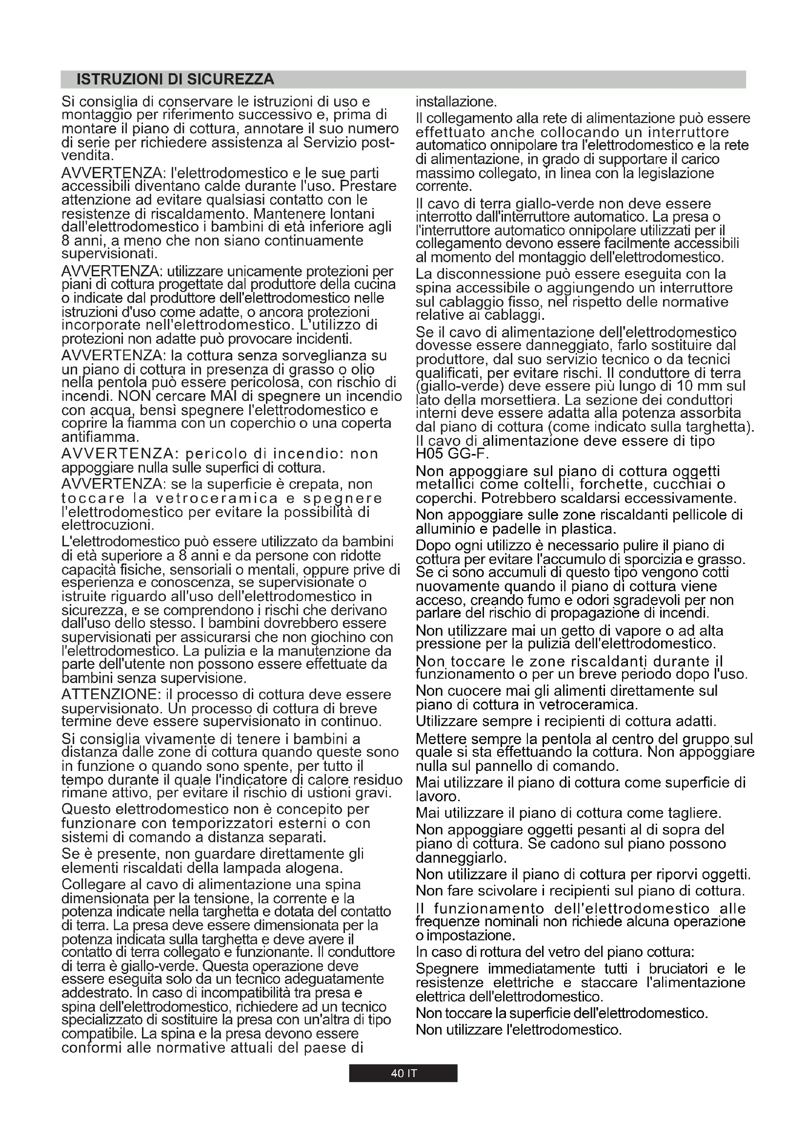 - da je dovod plina brezhiben DA40 IT AVVERTENZA: l'elettrodomestico e le sue parti accessibili diventano calde durante l'uso. Prestare attenzione ad evitare qualsiasi contatto con le resistenze di riscaldamento. Mantenere lontani dall'elettrodomestico i bambini di età inferiore agli 8 anni, a meno che non siano continuamente supervisionati. Si consiglia di conservare le istruzioni di uso e montaggio per riferimento successivo e, prima di montare il piano di cottura, annotare il suo numero di serie per richiedere assistenza al Servizio post- vendita. AVVERTENZA: la cottura senza sorveglianza su un piano di cottura in presenza di grasso o olio nella pentola può essere pericolosa, con rischio di incendi. NON cercare MAI di spegnere un incendio con acqua, bensì spegnere l'elettrodomestico e coprire la fiamma con un coperchio o una coperta antifiamma. AVVERTENZA: pericolo di incendio: non appoggiare nulla sulle superfici di cottura. AVVERTENZA: utilizzare unicamente protezioni per piani di cottura progettate dal produttore della cucina o indicate dal produttore dell'elettrodomestico nelle istruzioni d'uso come adatte, o ancora protezioni incorporate nell'elettrodomestico. L'utilizzo di protezioni non adatte può provocare incidenti. AVVERTENZA: se la superficie è crepata, non toccare la vetroceramica e spegnere l'elettrodomestico per evitare la possibilità di elettrocuzioni. L'elettrodomestico può essere utilizzato da bambini di età superiore a 8 anni e da persone con ridotte capacità fisiche, sensoriali o mentali, oppure prive di esperienza e conoscenza, se supervisionate o istruite riguardo all'uso dell'elettrodomestico in sicurezza, e se comprendono i rischi che derivano dall'uso dello stesso. I bambini dovrebbero essere supervisionati per assicurarsi che non giochino con l'elettrodomestico. La pulizia e la manutenzione da parte dell'utente non possono essere effettuate da bambini senza supervisione. ATTENZIONE: il processo di cottura deve essere supervisionato. Un processo di cottura di breve termine deve essere supervisionato in continuo. Si consiglia vivamente di tenere i bambini a distanza dalle zone di cottura quando queste sono in funzione o quando sono spente, per tutto il tempo durante il quale l'indicatore di calore residuo rimane attivo, per evitare il rischio di ustioni gravi. Questo elettrodomestico non è concepito per funzionare con temporizzatori esterni o con sistemi di comando a distanza separati. Collegare al cavo di alimentazione una spina dimensionata per la tensione, la corrente e la potenza indicate nella targhetta e dotata del contatto di terra. La presa deve essere dimensionata per la potenza indicata sulla targhetta e deve avere il contatto di terra collegato e funzionante. Il conduttore di terra è giallo-verde. Questa operazione deve essere eseguita solo da un tecnico adeguatamente addestrato. In caso di incompatibilità tra presa e spina dell'elettrodomestico, richiedere ad un tecnico specializzato di sostituire la presa con un'altra di tipo compatibile. La spina e la presa devono essere conformi alle normative attuali del paese di Se è presente, non guardare direttamente gli elementi riscaldati della lampada alogena.