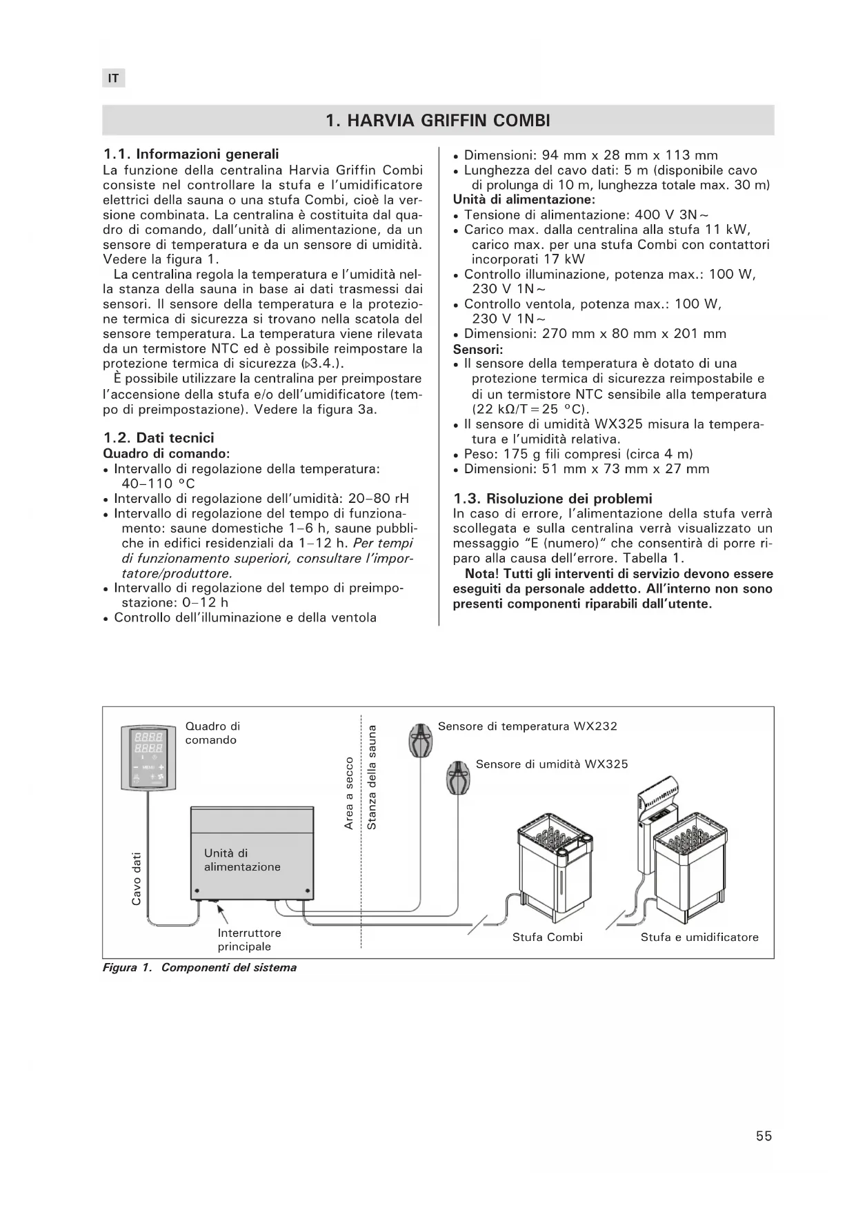 Sensore di temperatura WX232 Stufa Combi Quadro di comando Unità di alimentazione Stanza della sauna Area a secco Sensore di umidità WX325 Interruttore principale Stufa e umidificatore 1.1. Informazioni generali La funzione della centralina Harvia Griffin Combi consiste nel controllare la stufa e l’umidificatore elettrici della sauna o una stufa Combi, cioè la ver- sione combinata. La centralina è costituita dal qua- dro di comando, dall’unità di alimentazione, da un sensore di temperatura e da un sensore di umidità. Vedere la figura 1. La centralina regola la temperatura e l’umidità nel- la stanza della sauna in base ai dati trasmessi dai sensori. Il sensore della temperatura e la protezio- ne termica di sicurezza si trovano nella scatola del sensore temperatura. La temperatura viene rilevata da un termistore NTC ed è possibile reimpostare la protezione termica di sicurezza (