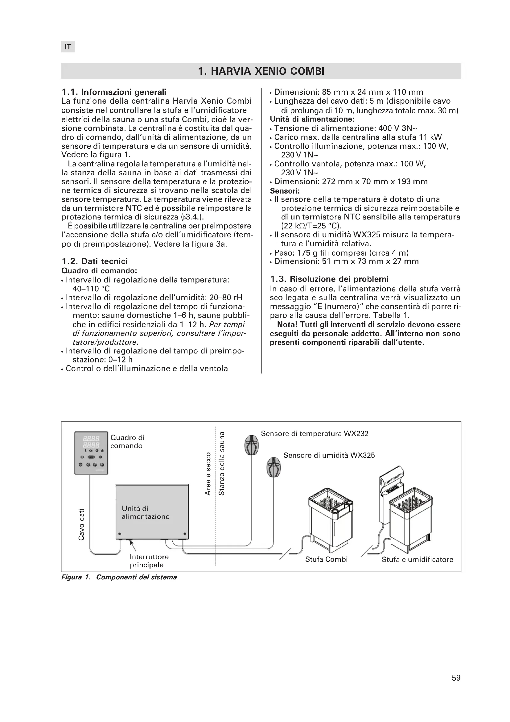 Sensore di temperatura WX232 Stufa Combi Quadro di comando Unità di alimentazione Stanza della sauna Area a secco Sensore di umidità WX325 Interruttore principale Stufa e umidicatore 1.1. Informazioni generali La funzione della centralina Harvia Xenio Combi consiste nel controllare la stufa e l’umidicatore elettrici della sauna o una stufa Combi, cioè la ver- sione combinata. La centralina è costituita dal qua- dro di comando, dall’unità di alimentazione, da un sensore di temperatura e da un sensore di umidità. Vedere la gura 1. La centralina regola la temperatura e l’umidità nel- la stanza della sauna in base ai dati trasmessi dai sensori. Il sensore della temperatura e la protezio- ne termica di sicurezza si trovano nella scatola del sensore temperatura. La temperatura viene rilevata da un termistore NTC ed è possibile reimpostare la protezione termica di sicurezza ( 3.4.). È possibile utilizzare la centralina per preimpostare l’accensione della stufa e/o dell’umidicatore (tem- po di preimpostazione). Vedere la gura 3a. 1.2. Dati tecnici Quadro di comando: