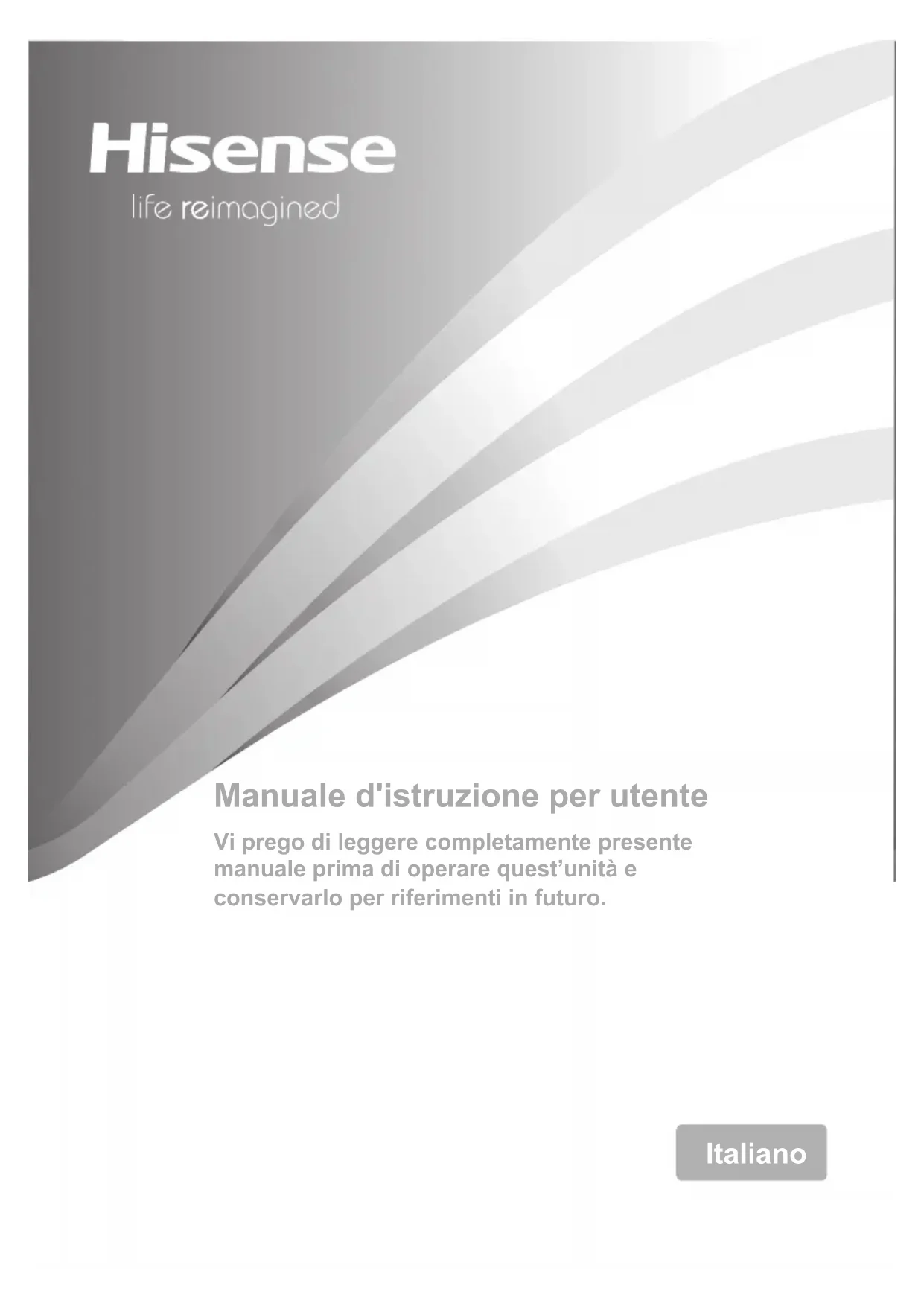 ~Manuale d'istruzione per utente Vi prego di leggere completamente presente manuale prima di operare quest’unità e conservarlo per riferimenti in futuro. Italiano2 Hisense Refrigerator Indice Per la vostra sicurezza e l'uso corretto prima dell'installazione e del primo utilizzo, leggere attentamente il presente manuale, inclusi i suggerimenti e avvertenze. Per evitare errori e incidenti, è importante garantire che tutte le persone che utilizzano l'apparecchio ne conoscano il funzionamento e le caratteristiche di sicurezza. Conservare le seguenti istruzioni ed assicurarsi che rimangano con l'apparecchio in caso di trasporto o di vendita, in modo che chiunque lo utilizzi per tutta la sua vita sia adeguatamente informato sull’uso corretto e sulla sicurezza dell’apparecchio Ai fini della sicurezza delle persone e delle proprietà, osservare le precauzioni indicate nelle istruzioni: il costruttore non può essere considerate responsabile per eventuali danni causati da omissioni. Sicurezza per i bambini e per le persone vulnerabili In base alla norma EN Questo apparecchio non è concepito per l’utilizzo da parte di bambini o persone con capacità fisiche, sensoriale o mentali ridotte, senza la necessaria esperienza e competenza e senza la supervisione o le indicazioni di una persona responsabile per la loro sicurezza. È necessario accertarsi che i bambini non giochino con l’apparecchio. La pulizia e la manutenzione non devono essere eseguito da bambini senza supervisione.. In base alla norma IEC Quest'apparecchio non deve essere utilizzato da persone (bambini inclusi) con capacità fisiche, sensoriali o mentali ridotte, o in mancanza di esperienza e conoscenza, a meno che non siano controllati o istruiti all'uso dell'apparecchio in modo sicuro e comprendano i rischi derivanti. Informazioni e avvertenze sulla sicurezza Informazioni e avvertenze sulla sicurezza-2 Installazione del nuovo apparecchio----8 Invertire la porta -----------------------------9Descrizione del dispositivo----------------13 Funzionamento------------------------------13 Uso dell'apparecchio ----------------------15Consigli e suggerimenti utili -------------18 Pulizia e manutenzione ------------------19 Risoluzione dei problemi -----------------21Smaltimento dell’apparecchio-----------223 Hisense Refrigerator Tenere tutti gli elementi deH’imballo fuori dalla portata dei bambini per evitare il rischio di soffocamento. In caso di smaltimento dell’apparecchio, staccare la spina dalla presa di corrente, tagliare il cavo di connessione (il più vicino possibile all’apparecchio) e rimuovere la porta per evitare che i bambini possano ricevere una scossa elettrica o rimangano bloccati aH’intemo. Se questo apparecchio con chiusure magnetiche della porta sostituisce un apparecchio precedente con chiusura a molla sulla porta o sul coperchio, accertarsi di rendere inutilizzabile tale chiusura a molla prima di smaltire. Ciò evita una trappola mortale per bambini. Indicazioni sulla Sicurezza Generale Avvertenza - Quest’apparecchio è destinato ad uso domestico e quelli simili come: -Aree adibite a cucina per il personale in negozi, uffici e altri ambienti di lavoro; -Fattorie da parte di clienti in hotel, motel e altri ambienti di tipo residenziale; -Ambienti di tipo B&B -Tipo di ristorazione e commercio al dettaglio e simile. Avvertenza - Non conservare le sostanze esplosive come latini di aerosol con i propellenti infiammabili nell’apparecchio. Avvertenza - Se il cavo di alimentazione è danneggiato, procedere alla sua sostituzione contattando il produttore, il rappresentante locale o personale qualificato al fine di evitare ogni rischio della sicurezza. Avvertenza - Non coprire le aperture di aerazione e la ritiene fuori di ostruzione. Avvertenza - Si raccomanda di non usare dispositivi meccanici o altri mezzi per accelerare il processo di sbrinamento, diversi da quelli raccomandati dal produttore. Avvertenza - Non danneggiare il circuito refrigerante. Avvertenza - Non accendere apparecchi elettrici aH’interno dei compartimenti degli alimenti, a meno che ciò non sia raccomandato dal produttore.4 Hisense Refrigerator Avvertenza - Il refrigerante e gas isolato sono infiammabili. Quando smaltisce l’apparecchio farlo solo in centro di smaltimento dei rifiuti autorizzati. Non esporla a fiamme. AVVERTENZA - Quando si posiziona l'apparecchio, assicurarsi che il cavo di alimentazione non sia intrappolato o danneggiato. AVVERTENZA - Non posizionare prese multiple portatili o alimentatori portatili nella parte posteriore dell'apparecchio. Frigorifero Il frigorifero contiene una piccola quantità di refrigerante isobutene (R600a) nel circuito refrigerante, che è un gas naturale con alta compatibilità ambientale ma infiammabile. Assicurare che ciascuno dei componenti non viene danneggiato durante il trasporto o l’installazione. Il refrigerante (R600a) è infiammabile. In caso che il circuito refrigerante venga danneggiato: - Evitare fiamme libere o scintilla. - Aerare la stanza in cui si trova l’apparecchio. AVVERTENZA - I frigoriferi contengono refrigerante e gas nell'isolamento. Il refrigerante e i gas devono essere smaltiti professionalmente in quanto possono causare lesioni agli occhi o combustione. Assicurarsi che la tubatura del circuito del refrigerante non sia danneggiata prima del corretto smaltimento. È pericoloso alterare le caratteristiche o modificare il prodotto in altro modo. Qualsiasi danneggiamento su cavo potrebbe causare cortocircuito, incendio e/o scossa elettrica. Sostituzione dell'illuminazione AVVERTENZA - L’illuminazione non dev’essere sostituita dall’utente! Se l’illuminazione è danneggiata, contattare l’assistenza tecnica Questo avviso è solo per i frigoriferi che contengono illuminazione. Rischio di incendio/materiali infiammabili