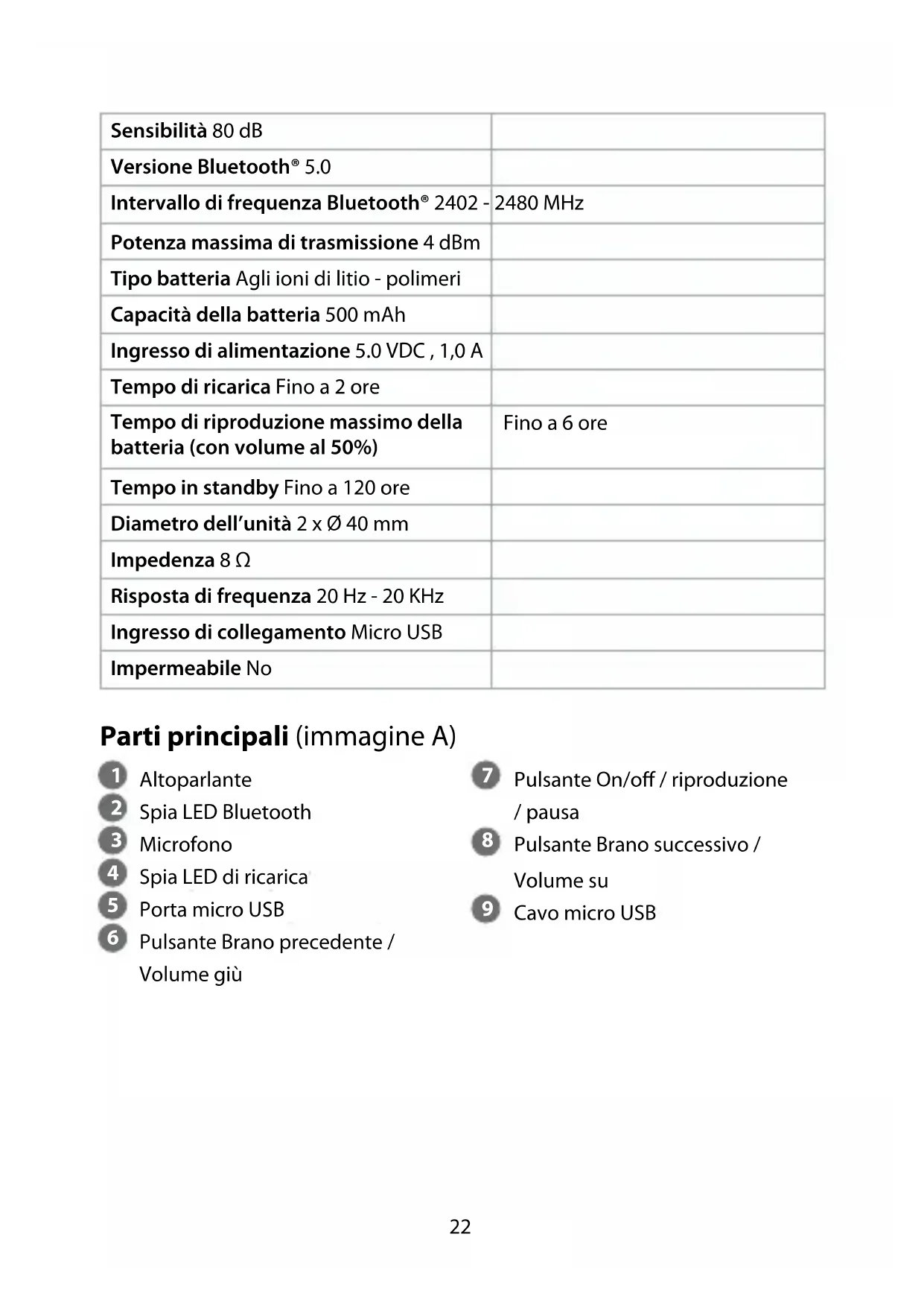 Guida rapida all’avvio Altoparlante da collo Bluetooth® SPBT5010BK Per maggiori informazioni vedere il manuale esteso online: ned.is/spbt5010bk Uso previsto Nedis SPBT5010BK è un altoparlante da collo Bluetooth che riproduce l’audio dal proprio dispositivo multimediale. Il microfono integrato consente di eettuare chiamate telefoniche in viva voce. Eventuali modiche al prodotto possono comportare conseguenze per la sicurezza, la garanzia e il corretto funzionamento. Speciche Prodotto Altoparlante da collo Bluetooth® Numero articolo SPBT5010BK Microfono incorporato Sì Altoparlante RMS 2 x 1,5 W Potenza di picco dell’altoparlante 2 x 4.5 W22 Sensibilità 80 dB Versione Bluetooth® 5.0 Intervallo di frequenza Bluetooth® 2402 - 2480 MHz Potenza massima di trasmissione 4 dBm Tipo batteria Agli ioni di litio - polimeri Capacità della batteria 500 mAh Ingresso di alimentazione 5.0 VDC , 1,0 A Tempo di ricarica Fino a 2 ore Tempo di riproduzione massimo della batteria (con volume al 50%) Fino a 6 ore Tempo in standby Fino a 120 ore Diametro dell’unità 2 x Ø 40 mm Impedenza 8 Ω Risposta di frequenza 20 Hz - 20 KHz Ingresso di collegamento Micro USB Impermeabile No Parti principali (immagine A)