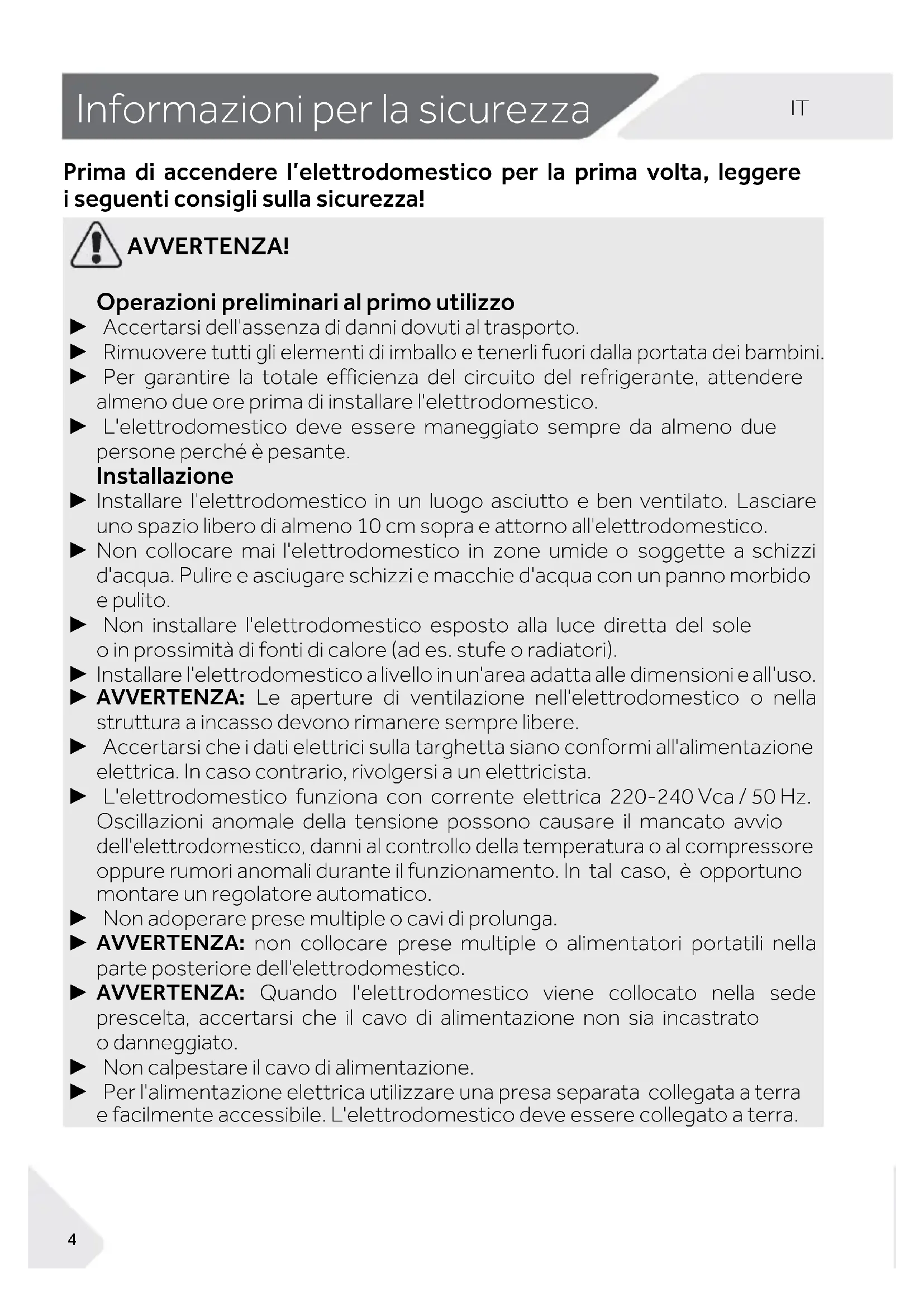 Informazioni per la sicurezza Prima di accendere l’elettrodomestico per la prima volta, leggere i seguenti consigli sulla sicurezza! AVVERTENZA! Operazioni preliminari al primo utilizzo ► Accertarsi dell'assenza di danni dovuti al trasporto. ► Rimuovere tutti gli elementi di imballo e tenerli fuori dalla portata dei bambini. ► Per garantire la totale efficienza del circuito del refrigerante, attendere almeno due ore prima di installare l'elettrodomestico. ► L'elettrodomestico deve essere maneggiato sempre da almeno due persone perché è pesante. Installazione ► Installare l'elettrodomestico in un luogo asciutto e ben ventilato. Lasciare uno spazio libero di almeno 10 cm sopra e attorno all'elettrodomestico. ► Non collocare mai l'elettrodomestico in zone umide o soggette a schizzi d'acqua. Pulire e asciugare schizzi e macchie d'acqua con un panno morbido e pulito. ► Non installare l'elettrodomestico esposto alla luce diretta del sole o in prossimità di fonti di calore (ad es. stufe o radiatori). ► Installare l'elettrodomestico a livello in un'area adatta alle dimensioni e all'uso. ► AVVERTENZA: Le aperture di ventilazione nell'elettrodomestico o nella struttura a incasso devono rimanere sempre libere. ► Accertarsi che i dati elettrici sulla targhetta siano conformi all'alimentazione elettrica. In caso contrario, rivolgersi a un elettricista. ► L'elettrodomestico funziona con corrente elettrica 220-240 Vca / 50 Hz. Oscillazioni anomale della tensione possono causare il mancato avvio dell'elettrodomestico, danni al controllo della temperatura o al compressore oppure rumori anomali durante il funzionamento. In tal caso, è opportuno montare un regolatore automatico. ► Non adoperare prese multiple o cavi di prolunga. ► AVVERTENZA: non collocare prese multiple o alimentatori portatili nella parte posteriore dell'elettrodomestico. ► AVVERTENZA: Quando l'elettrodomestico viene collocato nella sede prescelta, accertarsi che il cavo di alimentazione non sia incastrato o danneggiato. ► Non calpestare il cavo di alimentazione. ► Per l'alimentazione elettrica utilizzare una presa separata collegata a terra e facilmente accessibile. L'elettrodomestico deve essere collegato a terra.IT Informazioni per la sicurezza