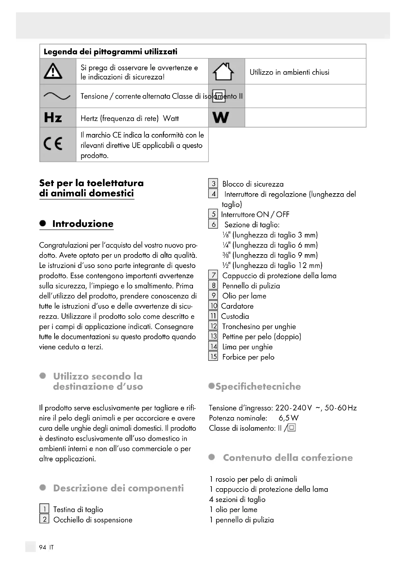 , 50 - 60 Hz Potenza nominale: 6,5 W Classe di isolamento: II / Contenuto della confezione 1 rasoio per pelo di animali 1 cappuccio di protezione della lama 4 sezioni di taglio 1 olio per lame 1 pennello di pulizia95 IT 1 cardatore 1 custodia 1 tronchesino per unghie 1 pettine per pelo (doppio) 1 lima per unghie 1 forbice per pelo 1 manuale di istruzioni per l‘uso e la sicurezza Avvertenze per la sicurezza