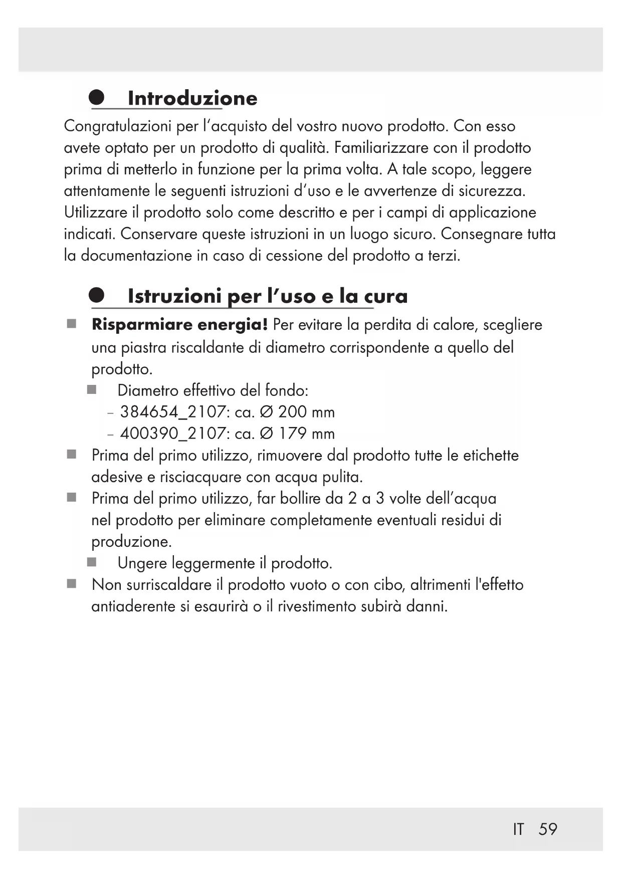 Introduzione Congratulazioni per l‘acquisto del vostro nuovo prodotto. Con esso avete optato per un prodotto di qualità. Familiarizzare con il prodotto prima di metterlo in funzione per la prima volta. A tale scopo, leggere attentamente le seguenti istruzioni d‘uso e le avvertenze di sicurezza. Utilizzare il prodotto solo come descritto e per i campi di applicazione indicati. Conservare queste istruzioni in un luogo sicuro. Consegnare tutta la documentazione in caso di cessione del prodotto a terzi. Istruzioni per l’uso e la cura Risparmiare energia! Per evitare la perdita di calore, scegliere una piastra riscaldante di diametro corrispondente a quello del prodotto. Diametro effettivo del fondo: – 384654_2107: ca. Ø 200mm – 400390_2107: ca. Ø 179mm Prima del primo utilizzo, rimuovere dal prodotto tutte le etichette adesive e risciacquare con acqua pulita. Prima del primo utilizzo, far bollire da 2a 3volte dell’acqua nel prodotto per eliminare completamente eventuali residui di produzione. Ungere leggermente il prodotto. Non surriscaldare il prodotto vuoto o con cibo, altrimenti l'effetto antiaderente si esaurirà o il rivestimento subirà danni.60 IT Pericolo di surriscaldamento! In un prodotto surriscaldato e non ingrassato, in caso di contatto con alimenti non grassi, può verificarsi lo scolorimento del rivestimento antiaderente a causa della combustione delle proteine. Questi scolorimenti sono da considerarsi come segni d'utilizzo e non pregiudicano la qualità del rivestimento o la sua utilizzabilità. Riscaldare il cibo a fuoco medio/alto, quindi terminare la cottura a fuoco basso. Non lasciare il prodotto incustodito quando il grasso si riscalda: Il grasso surriscaldato può prendere fuoco. Mai spegnere l’olio che brucia con dell’acqua! Soffocare le fiamme con un coperchio o con una coperta di lana spessa. Utilizzare esclusivamente utensili da cucina in plastica o legno, al fine di non danneggiare il rivestimento antiaderente. Non tagliare il cibo direttamente nel prodotto. Non mettere carne bagnata e gocciolante nel prodotto. Gli spruzzi di grasso sul piano di cottura incandescente possono provocare facilmente un incendio. Durante la cottura, il manico può riscaldarsi. Per garantire la propria sicurezza, utilizzare una presina o guanti da forno. Il prodotto è adatto per piastre di cottura a gas, elettriche, in vetroceramica, a induzione e alogene.61IT Suggerimento per l’uso su piano di cottura a induzione: In determinate circostanze, può verificarsi un rumore dovuto alle proprietà elettromagnetiche della fonte di calore e del prodotto. Questo è normale e non indica un difetto del piano cottura a induzione o delle pentole. Il prodotto va posizionato al centro del piano cottura a induzione. ATTENZIONE! Elevata velocità di riscaldamento! Non preriscaldare eccessivamente la padella. In caso di surriscaldamento, lasciar aerare completamente il locale. Questo prodotto combina i vantaggi delle pentole in alluminio, come il peso ridotto e l'elevata conducibilità termica, con quelli della cottura ad induzione. Per rendere questo possibile, inserti magnetici in acciaio sono stati aggiunti al fondo in alluminio. Di conseguenza, il fondo non è completamente magnetico, in modo che, se adagiato su piani di cottura a induzione significativamente più grandi del diametro di fondo, può accadere che non vi siano reazioni delle bobine a induzione. Questo non è un difetto di qualità e non compromette la funzionalità. Per un perfetto funzionamento del prodotto, posizionarlo sempre sul piano cottura che corrisponde al diametro effettivo del fondo specificato in queste istruzioni. Le alte temperature possono portare allo scolorimento dell'esterno del prodotto. Questo non è un difetto del materiale e non influisce sulla qualità o sul funzionamento del prodotto. Mai tenere il prodotto rovente sotto acqua corrente fredda. La parte inferiore del prodotto potrebbe subire danni o usurarsi.62 IT Il prodotto è adatto a mantenere gli alimenti caldi in forno (max. 160°C per 1ora). Il prodotto è lavabile in lavastoviglie. Per il risciacquo a mano, utilizzare acqua calda e un normale detersivo per piatti. Non utilizzare oggetti taglienti e appuntiti o spazzole, al fine di non danneggiare il materiale. Non pulire usando sostanze abrasive aggressive. Una pulizia frequente con detergenti aggressivi può danneggiare e/o scolorire il prodotto. Il risciacquo in lavastoviglie può scolorire i componenti in alluminio. ATTENZIONE! GRAFFI! Evitare di spingere il prodotto avanti e indietro sui piani cottura in vetroceramica! Prima di iniziare la cottura, si consiglia di pulire la superficie del piano e il fondo del prodotto con un panno pulito che non lasci pelucchi (ad esempio, in microfibra). Questo consente di prevenire la formazione di graffi. Per alimenti: Il prodotto non influenza il gusto e l’odore dei cibi preparati. Non utilizzare il prodotto se le impugnature sono allentate. Eventualmente, fissare bene il manico. Smaltimento L’imballaggio è composto da materiali ecologici che possono essere smaltiti presso i siti di raccolta locali per il riciclo. E’ possibile informarsi circa le possibilità di smaltimento del prodotto usato presso l’amministrazione comunale o cittadina.63IT Garanzia Il prodotto è stato prodotto secondo severe direttive di qualità e controllato con premura prima della consegna. In caso di difetti del prodotto, l‘acquirente può far valere i propri diritti legali nei confronti del venditore. Questi diritti legali non vengono limitati in alcun modo dalla garanzia di seguito riportata. Questo prodotto è garantito per 3 anni a partire dalla data di acquisto. Il termine di garanzia ha inizio a partire dalla data di acquisto. Conservare lo scontrino di acquisto originale in buone condizioni. Questo documento servirà a documentare l‘avvenuto acquisto. Il prodotto da Lei acquistato dà diritto ad una garanzia di 3 anni a partire dalla data di acquisto