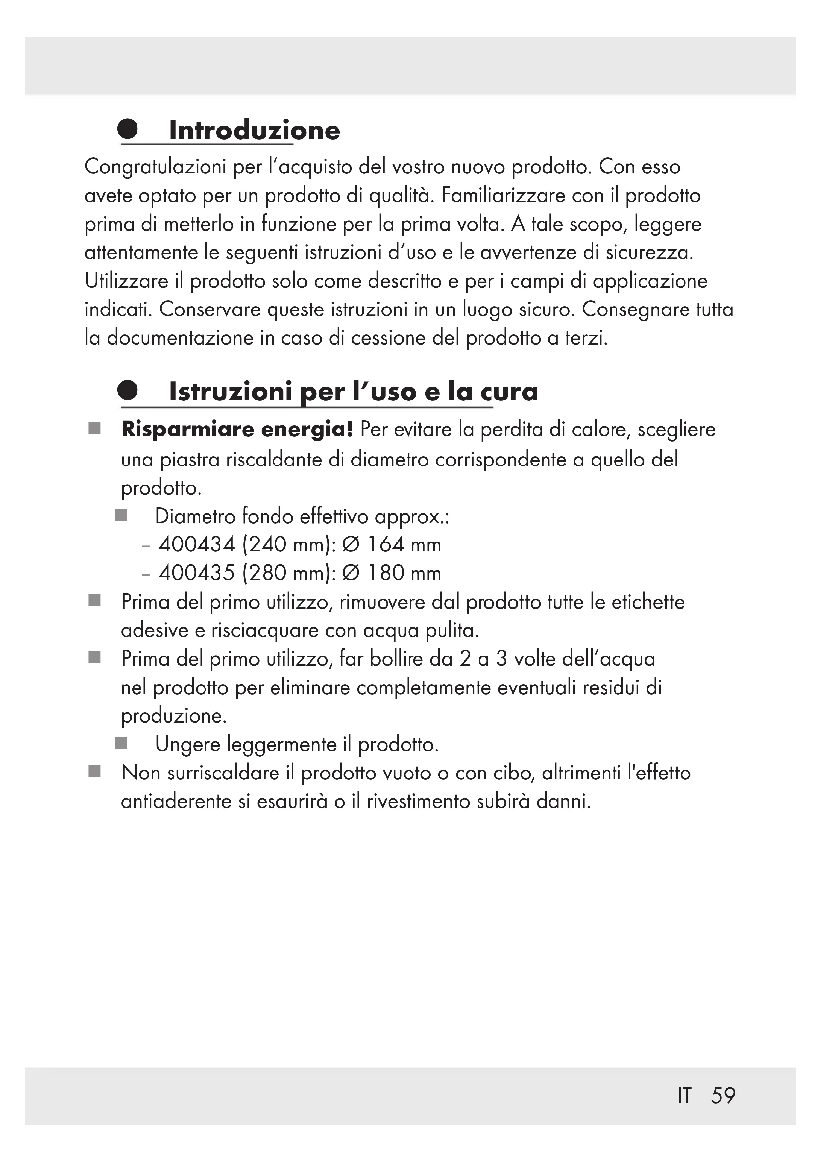 Introduzione Congratulazioni per l‘acquisto del vostro nuovo prodotto. Con esso avete optato per un prodotto di qualità. Familiarizzare con il prodotto prima di metterlo in funzione per la prima volta. A tale scopo, leggere attentamente le seguenti istruzioni d‘uso e le avvertenze di sicurezza. Utilizzare il prodotto solo come descritto e per i campi di applicazione indicati. Conservare queste istruzioni in un luogo sicuro. Consegnare tutta la documentazione in caso di cessione del prodotto a terzi. Istruzioni per l’uso e la cura Risparmiare energia! Per evitare la perdita di calore, scegliere una piastra riscaldante di diametro corrispondente a quello del prodotto. Diametro fondo effettivo approx.: – 400434 (240mm): Ø 164mm – 400435 (280mm): Ø 180mm Prima del primo utilizzo, rimuovere dal prodotto tutte le etichette adesive e risciacquare con acqua pulita. Prima del primo utilizzo, far bollire da 2a 3volte dell’acqua nel prodotto per eliminare completamente eventuali residui di produzione. Ungere leggermente il prodotto. Non surriscaldare il prodotto vuoto o con cibo, altrimenti l'effetto antiaderente si esaurirà o il rivestimento subirà danni.60 IT Pericolo di surriscaldamento! Nelle padelle surriscaldate non ingrassate, in caso di contatto con alimenti non grassi, può verificarsi lo scolorimento del rivestimento antiaderente a causa della combustione delle proteine. Questi scolorimenti sono da considerarsi come segni d'utilizzo e non pregiudicano la qualità del rivestimento o la sua utilizzabilità. Riscaldare il cibo a fuoco medio/alto, quindi terminare la cottura a fuoco basso. Non lasciare il prodotto incustodito quando il grasso si riscalda: Il grasso surriscaldato può prendere fuoco. Mai spegnere l’olio che brucia con dell’acqua! Soffocare le fiamme con un coperchio o con una coperta di lana spessa. Utilizzare esclusivamente utensili da cucina in plastica o legno, al fine di non danneggiare il rivestimento antiaderente. Non tagliare il cibo direttamente nel prodotto. Non mettere carne bagnata e gocciolante nel prodotto. Gli spruzzi di grasso sul piano di cottura incandescente possono provocare facilmente un incendio. Durante la cottura, il manico può riscaldarsi. Per garantire la propria sicurezza, utilizzare una presina o guanti da forno. Il prodotto è adatto per piastre di cottura a gas, elettriche, in vetroceramica, a induzione e alogene.61IT Suggerimento per l’uso su piano di cottura a induzione: In determinate circostanze, può verificarsi un rumore dovuto alle proprietà elettromagnetiche della fonte di calore e del prodotto. Questo è normale e non indica un difetto del piano cottura a induzione o del prodotto. Il prodotto va posizionato al centro del piano cottura a induzione. ATTENZIONE! Elevata velocità di riscaldamento! Non surriscaldare il prodotto durante il preriscaldamento. In caso di surriscaldamento del prodotto, lasciar aerare completamente il locale. Questo prodotto combina i vantaggi delle pentole in alluminio, come il peso ridotto e l'elevata conducibilità termica, con quelli della cottura ad induzione. Per rendere questo possibile, inserti magnetici in acciaio sono stati aggiunti al fondo in alluminio. Di conseguenza, il fondo non è completamente magnetico, in modo che, se adagiato su piani di cottura a induzione significativamente più grandi del diametro di fondo, può accadere che non vi siano reazioni delle bobine a induzione. Questo non è un difetto di qualità e non compromette la funzionalità. Per un perfetto funzionamento del prodotto, posizionarlo sempre sul piano cottura che corrisponde al diametro effettivo del fondo specificato in queste istruzioni. Le alte temperature possono portare allo scolorimento dell'esterno del prodotto. Questo non è un difetto del materiale e non influisce sulla qualità o sul funzionamento del prodotto. Mai tenere il prodotto rovente sotto acqua corrente fredda. La parte inferiore del prodotto potrebbe subire danni o usurarsi.62 IT Il prodotto è adatto a mantenere gli alimenti caldi in forno (max. 160°C per 1ora). Il prodotto è lavabile in lavastoviglie. Per il risciacquo a mano, utilizzare acqua calda e un normale detersivo per piatti. Non utilizzare oggetti taglienti e appuntiti o spazzole, al fine di non danneggiare il materiale. Non pulire usando sostanze abrasive aggressive. Una pulizia frequente con detergenti aggressivi può danneggiare e/o scolorire il prodotto. Il risciacquo in lavastoviglie può scolorire i componenti in alluminio. ATTENZIONE! GRAFFI! Evitare di spingere il prodotto avanti e indietro sui piani cottura in vetroceramica! Prima di iniziare la cottura, si consiglia di pulire la superficie del piano e il fondo del prodotto con un panno pulito che non lasci pelucchi (ad esempio, in microfibra). Questo consente di prevenire la formazione di graffi. Per alimenti: Il prodotto non influenza il gusto e l’odore dei cibi preparati. Non utilizzare il prodotto se l'impugnatura è allentata. Eventualmente, fissare bene l'impugnatura. Smaltimento L’imballaggio è composto da materiali ecologici che possono essere smaltiti presso i siti di raccolta locali per il riciclo. E’ possibile informarsi circa le possibilità di smaltimento del prodotto usato presso l’amministrazione comunale o cittadina.63IT Garanzia Il prodotto è stato prodotto secondo severe direttive di qualità e controllato con premura prima della consegna. In caso di difetti del prodotto, l‘acquirente può far valere i propri diritti legali nei confronti del venditore. Questi diritti legali non vengono limitati in alcun modo dalla garanzia di seguito riportata. Questo prodotto è garantito per 3 anni a partire dalla data di acquisto. Il termine di garanzia ha inizio a partire dalla data di acquisto. Conservare lo scontrino di acquisto originale in buone condizioni. Questo documento servirà a documentare l‘avvenuto acquisto. Il prodotto da Lei acquistato dà diritto ad una garanzia di 3 anni a part