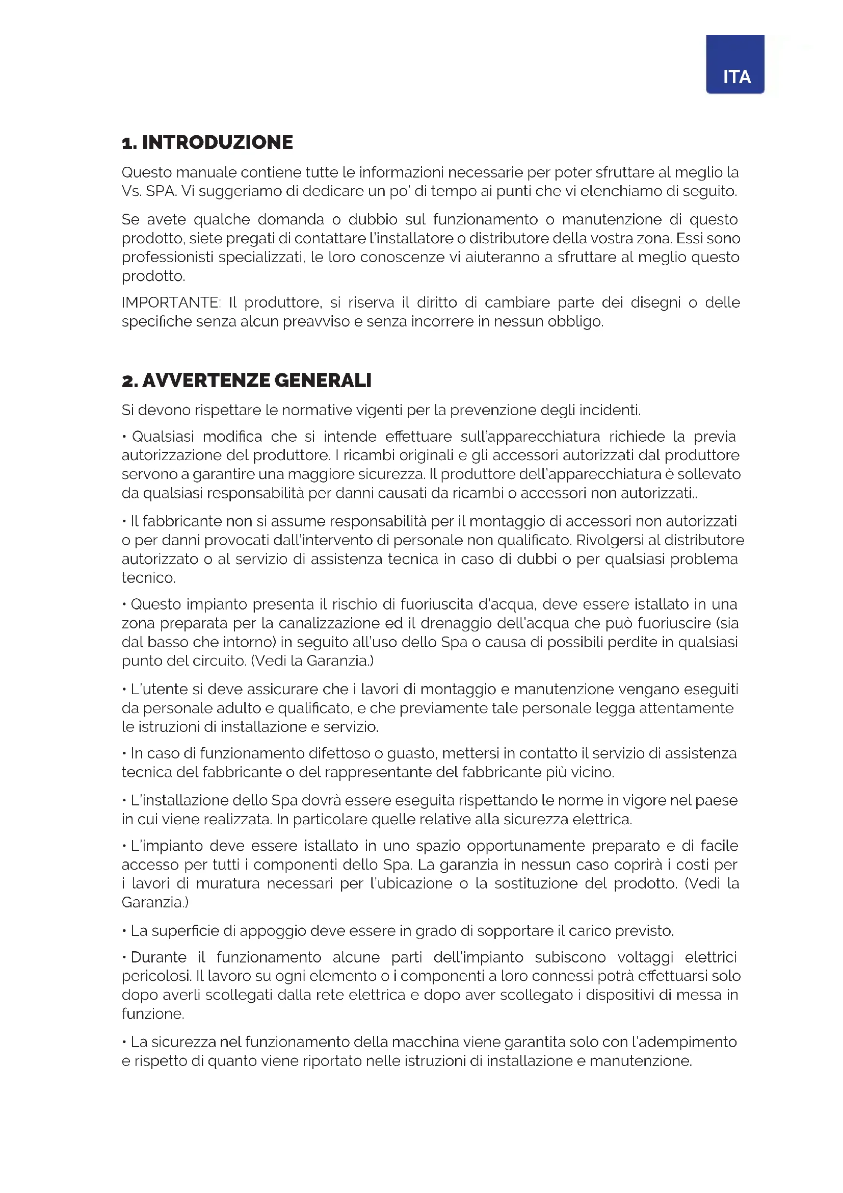 Questo manuale contiene tutte le informazioni necessarie per poter sfruttare al meglio la Vs. SPA. Vi suggeriamo di dedicare un po’ di tempo ai punti che vi elenchiamo di seguito. Se avete qualche domanda o dubbio sul funzionamento o manutenzione di questo prodotto, siete pregati di contattare l’installatore o distributore della vostra zona. Essi sono professionisti specializzati, le loro conoscenze vi aiuteranno a sfruttare al meglio questo prodotto. IMPORTANTE: Il produttore, si riserva il diritto di cambiare parte dei disegni o delle speciche senza alcun preavviso e senza incorrere in nessun obbligo.