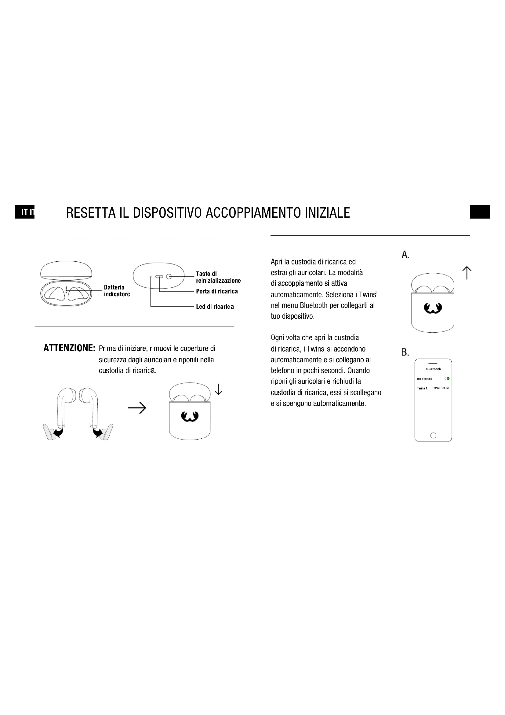 nel menu Bluetooth per collegarti al tuo dispositivo. Ogni volta che apri la custodia di ricarica, i Twins