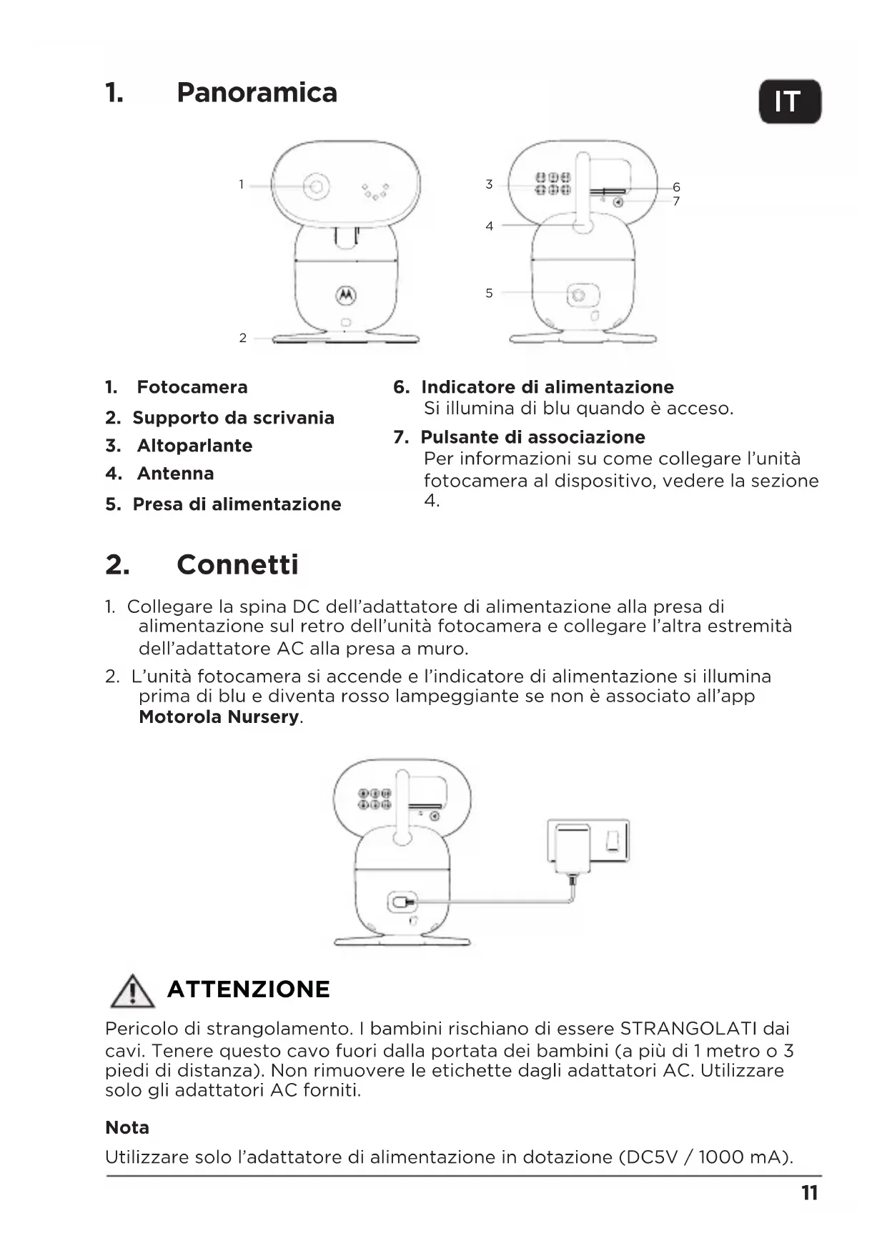 prima di blu e diventa rosso lampeggiante se non è associato all’app Motorola Nursery. ATTENZIONE Pericolo di strangolamento. I bambini rischiano di essere STRANGOLATI dai cavi. Tenere questo cavo fuori dalla portata dei bambini (a più di 1 metro o 3 piedi di distanza). Non rimuovere le etichette dagli adattatori AC. Utilizzare solo gli adattatori AC forniti. Nota Utilizzare solo l’adattatore di alimentazione in dotazione (DC5V / 1000 mA).