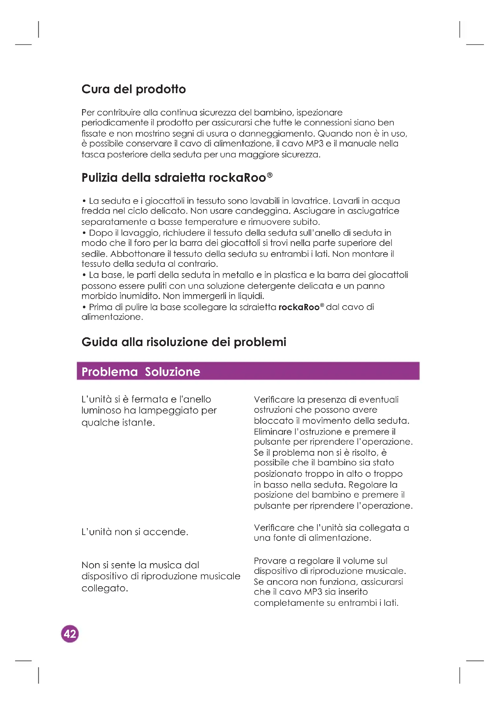 -onaylı bir aksesuarın kılavuzunda görsel olarak gösterilmeyen) herhangi bir parçasının çıkarılması veya değiştirilmesi bu garantiyi hükümsüz ve geçersiz kılabilir. Bu garanti sadece ilk alımın yapıldığı ülkede geçerlidir.42 Cura del prodotto Per contribuire alla continua sicurezza del bambino, ispezionare periodicamente il prodotto per assicurarsi che tutte le connessioni siano ben ssate e non mostrino segni di usura o danneggiamento. Quando non è in uso, è possibile conservare il cavo di alimentazione, il cavo MP3 e il manuale nella tasca posteriore della seduta per una maggiore sicurezza. Pulizia della sdraietta rockaRoo