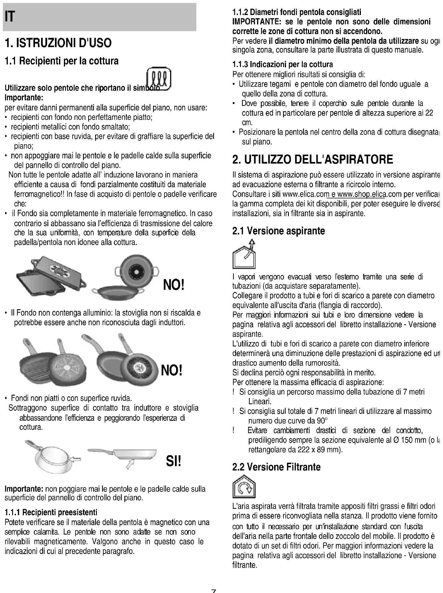 Il sistema di aspirazione può essere utilizzato in versione aspirante ad evacuazione esterna o filtrante a ricircolo interno. Consultare i siti www.elica.com e www.shop.elica.com per verificare la gamma completa dei kit disponibili, per poter eseguire le diverse installazioni, sia in filtrante sia in aspirante.