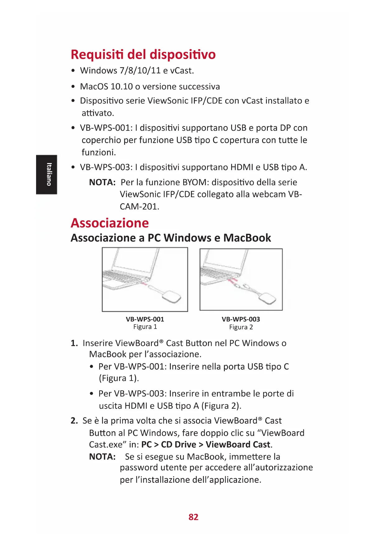 - VB-WPS-003: I disposivi supportano HDMI e USB po A. NOTA:ᅠ Per la funzione BYOM: disposivo della serie ViewSonic IFP/CDE collegato alla webcam VB- CAM-201. Associazione Associazione a PC Windows e MacBook VB-WPS-001 Figura 1 VB-WPS-003 Figura 2