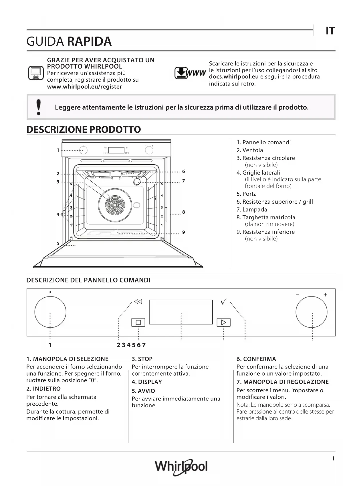 GUIDA RAPIDA GRAZIE PER AVER ACQUISTATO UN PRODOTTO WHIRLPOOLPer ricevere un’assistenza più completa, registrare il prodotto su www . whirlpool . eu/ register WWW Scaricare le istruzioni per la sicurezza e le istruzioni per l’uso collegandosi al sito docs. whirlpool . eu e seguire la procedura indicata sul retro. Leggere attentamente le istruzioni per la sicurezza prima di utilizzare il prodotto. DESCRIZIONE PRODOTTO 1. Pannello comandi2. Ventola3. Resistenza circolare(non visibile)4. Griglie laterali(il livello è indicato sulla partefrontale del forno)5. Porta6. Resistenza superiore / grill7. Lampada8. Targhetta matricola(da non rimuovere)9. Resistenza inferiore(non visibile)DESCRIZIONE DEL PANNELLO COMANDI 2 3 4 5 6 71. MANOPOLA DI SELEZIONEPer accendere il forno selezionandouna funzione. Per spegnere il forno,ruotare sulla posizione “0”.2. INDIETROPer tornare alla schermataprecedente.Durante la cottura, permette dimodificare le impostazioni.3. STOPPer interrompere la funzionecorrentemente attiva.4. DISPLAY5. AVVIOPer avviare immediatamente unafunzione.6. CONFERMAPer confermare la selezione di unafunzione o un valore impostato.7. MANOPOLA DI REGOLAZIONEPer scorrere i menu, impostare omodificare i valori.Nota: Le manopole sono a scomparsa.Fare pressione al centro delle stesse perestrarle dalla loro sede.