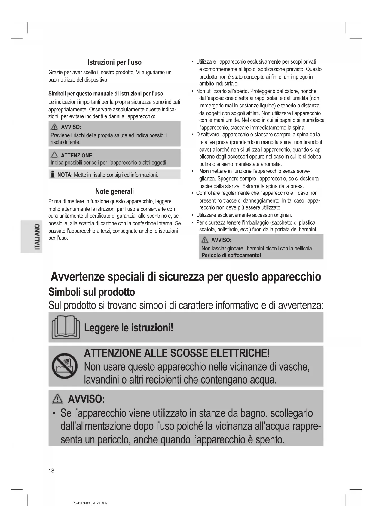 - Se l’apparecchio viene utilizzato in stanze da bagno, scollegarlo dall’alimentazione dopo l’uso poiché la vicinanza all’acqua rappre- senta un pericolo, anche quando l’apparecchio è spento.PC-HT3009_IM 29.08.17