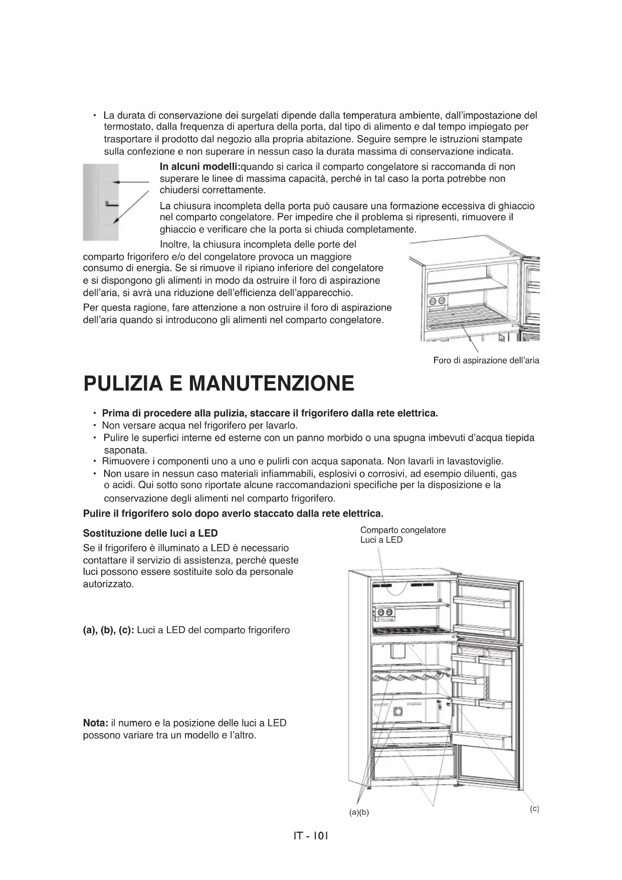 - Nonusareinnessuncasomaterialiinammabili,esplosiviocorrosivi,adesempiodiluenti,gas oacidi.Quisottosonoriportatealcuneraccomandazionispecicheperladisposizioneela conservazionedeglialimentinelcompartofrigorifero. Pulire il frigorifero solo dopo averlo staccato dalla rete elettrica. Sostituzione delle luci a LED SeilfrigoriferoèilluminatoaLEDènecessario contattareilserviziodiassistenza,perchéqueste lucipossonoesseresostituitesolodapersonale autorizzato. (a), (b), (c):LuciaLEDdelcompartofrigorifero Nota:ilnumeroelaposizionedelleluciaLED possonovariaretraunmodelloel’altro.