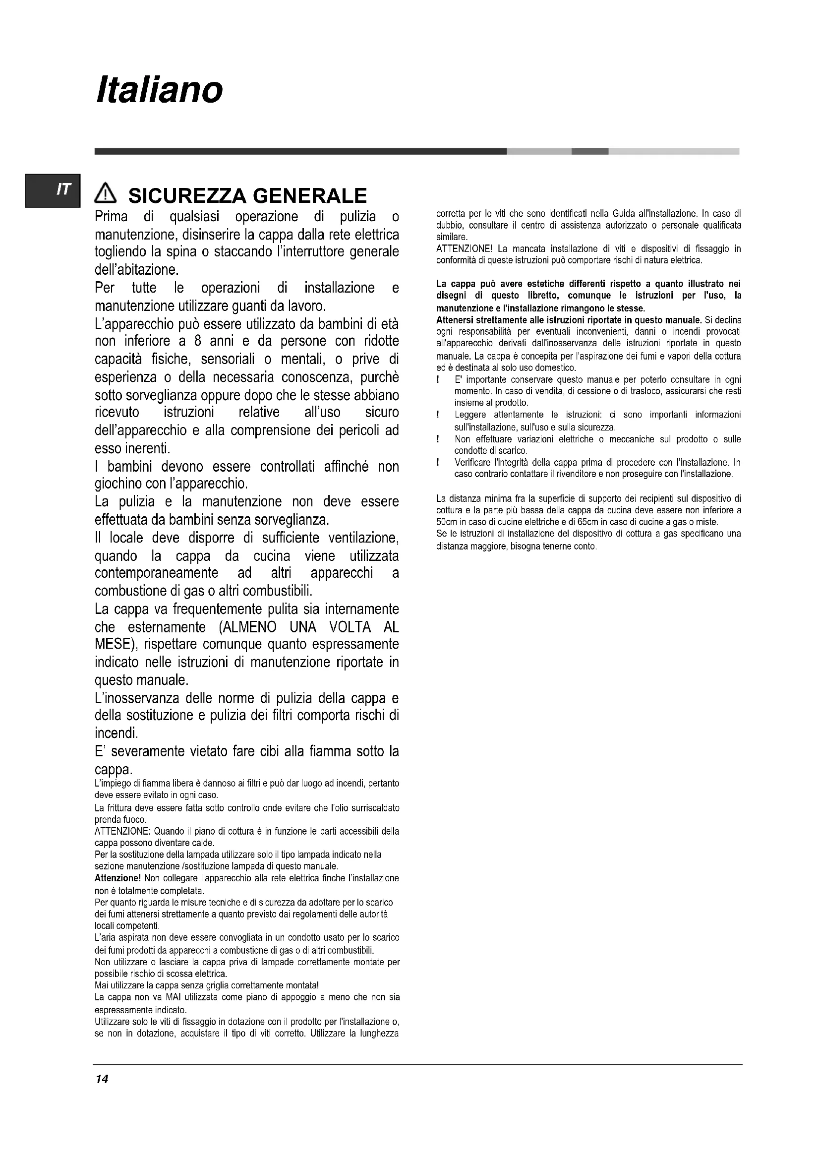 SICUREZZA GENERALE Prima di qualsiasi operazione di pulizia o manutenzione, disinserire la cappa dalla rete elettrica togliendo la spina o staccando l’interruttore generale dell’abitazione. Per tutte le operazioni di installazione e manutenzione utilizzare guanti da lavoro. L’apparecchio può essere utilizzato da bambini di età non inferiore a 8 anni e da persone con ridotte capacità fisiche, sensoriali o mentali, o prive di esperienza o della necessaria conoscenza, purchè sotto sorveglianza oppure dopo che le stesse abbiano ricevuto istruzioni relative all’uso sicuro dell’apparecchio e alla comprensione dei pericoli ad esso inerenti. I bambini devono essere controllati affinché non giochino con l’apparecchio. La pulizia e la manutenzione non deve essere effettuata da bambini senza sorveglianza. Il locale deve disporre di sufficiente ventilazione, quando la cappa da cucina viene utilizzata contemporaneamente ad altri apparecchi a combustione di gas o altri combustibili. La cappa va frequentemente pulita sia internamente che esternamente (ALMENO UNA VOLTA AL MESE), rispettare comunque quanto espressamente indicato nelle istruzioni di manutenzione riportate in questo manuale. L’inosservanza delle norme di pulizia della cappa e della sostituzione e pulizia dei filtri comporta rischi di incendi. E’ severamente vietato fare cibi alla fiamma sotto la cappa. L’impiego di fiamma libera è dannoso ai filtri e può dar luogo ad incendi, pertanto deve essere evitato in ogni caso. La frittura deve essere fatta sotto controllo onde evitare che l’olio surriscaldato prenda fuoco. ATTENZIONE: Quando il piano di cottura è in funzione le parti accessibili della cappa possono diventare calde. Per la sostituzione della lampada utilizzare solo il tipo lampada indicato nella sezione manutenzione /sostituzione lampada di questo manuale. Attenzione! Non collegare l’apparecchio alla rete elettrica finche l’installazione non è totalmente completata. Per quanto riguarda le misure tecniche e di sicurezza da adottare per lo scarico dei fumi attenersi strettamente a quanto previsto dai regolamenti delle autorità locali competenti. L’aria aspirata non deve essere convogliata in un condotto usato per lo scarico dei fumi prodotti da apparecchi a combustione di gas o di altri combustibili. Non utilizzare o lasciare la cappa priva di lampade correttamente montate per possibile rischio di scossa elettrica. Mai utilizzare la cappa senza griglia correttamente montata! La cappa non va MAI utilizzata come piano di appoggio a meno che non sia espressamente indicato. Utilizzare solo le viti di fissaggio in dotazione con il prodotto per l'installazione o, se non in dotazione, acquistare il tipo di viti corretto. Utilizzare la lunghezza corretta per le viti che sono identificati nella Guida all'installazione. In caso di dubbio, consultare il centro di assistenza autorizzato o personale qualificata similare. ATTENZIONE! La mancata installazione di viti e dispositivi di fissaggio in conformità di queste istruzioni può comportare rischi di natura elettrica. La cappa può avere estetiche differenti rispetto a quanto illustrato nei disegni di questo libretto, comunque le istruzioni per l'uso, la manutenzione e l'installazione rimangono le stesse. Attenersi strettamente alle istruzioni riportate in questo manuale. Si declina ogni responsabilità per eventuali inconvenienti, danni o incendi provocati all'apparecchio derivati dall'inosservanza delle istruzioni riportate in questo manuale. La cappa è concepita per l'aspirazione dei fumi e vapori della cottura ed è destinata al solo uso domestico. ! E' importante conservare questo manuale per poterlo consultare in ogni momento. In caso di vendita, di cessione o di trasloco, assicurarsi che resti insieme al prodotto. ! Leggere attentamente le istruzioni: ci sono importanti informazioni sull'installazione, sull'uso e sulla sicurezza. ! Non effettuare variazioni elettriche o meccaniche sul prodotto o sulle condotte di scarico. ! Verificare l'integrità della cappa prima di procedere con l’installazione. In caso contrario contattare il rivenditore e non proseguire con l'installazione. La distanza minima fra la superficie di supporto dei recipienti sul dispositivo di cottura e la parte più bassa della cappa da cucina deve essere non inferiore a 50cm in caso di cucine elettriche e di 65cm in caso di cucine a gas o miste. Se le istruzioni di installazione del dispositivo di cottura a gas specificano una distanza maggiore, bisogna tenerne conto.15 COLLEGAMENTO ELETTRICO La tensione di rete deve corrispondere alla tensione riportata sull’etichetta caratteristiche situata all’interno della cappa. Se provvista di spina allacciare la cappa ad una presa conforme alle norme vigenti posta in zona accessibile anche dopo l’installazione. Se sprovvista di spina (collegamento diretto alla rete) o la spina non è posta in zona accessibile, anche dopo installazione, applicare un interruttore bipolare a norma che assicuri la disconnessione completa della rete nelle condizioni della categoria di sovratensione III, conformemente alle regole di installazione. Attenzione! Prima di ricollegare il circuito della cappa all’alimentazione di rete e di verificarne il corretto funzionamento, controllare sempre che il cavo di rete sia stato montato correttamente. Sostituzione del cavo di alimentazione La cappa è provvista di un cavo alimentazione speciale; in caso di danneggiamento del cavo, richiederlo al servizio assistenza tecnica.