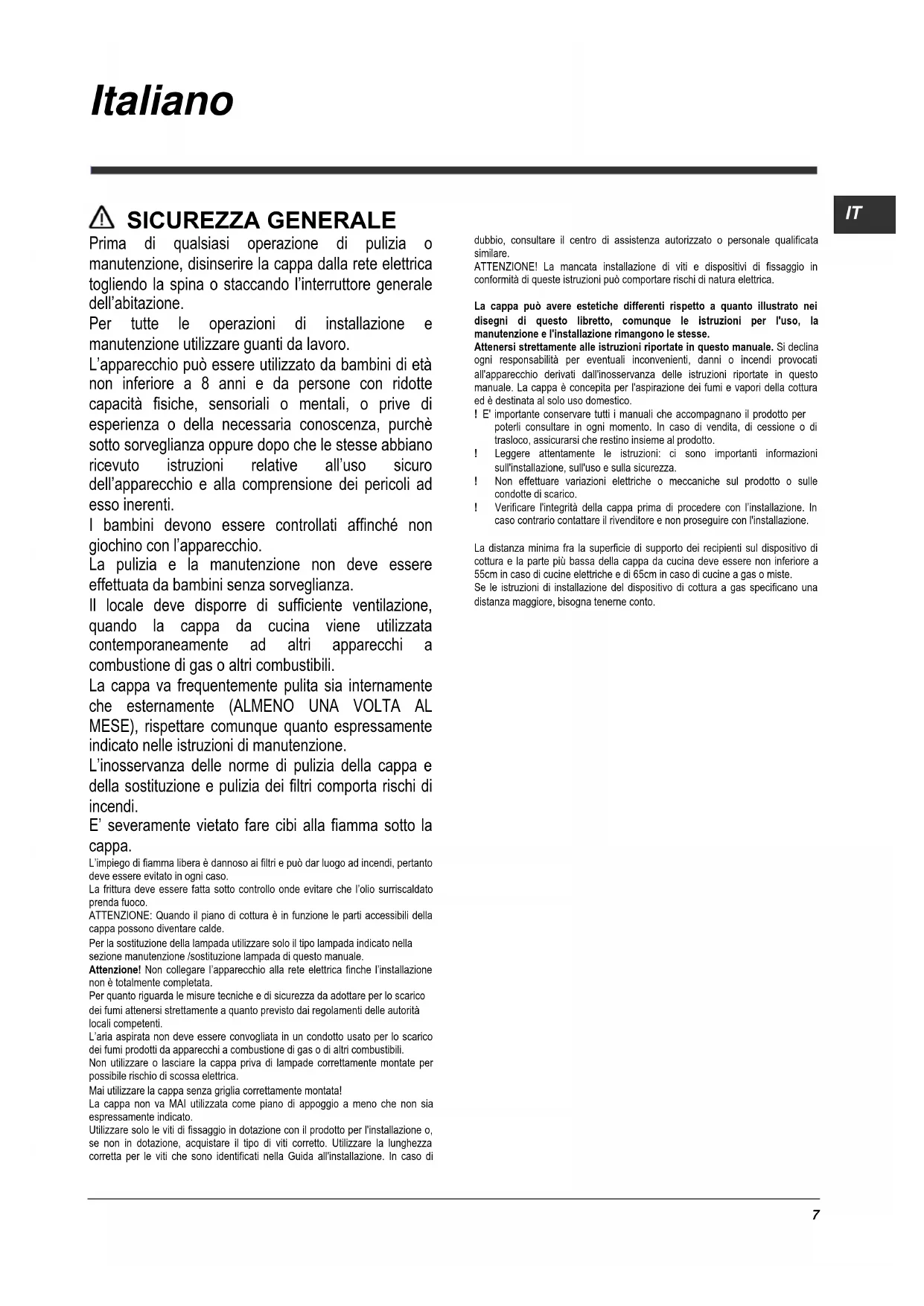 SICUREZZA GENERALE Prima di qualsiasi operazione di pulizia o manutenzione, disinserire la cappa dalla rete elettrica togliendo la spina o staccando l’interruttore generale dell’abitazione. Per tutte le operazioni di installazione e manutenzione utilizzare guanti da lavoro. L’apparecchio può essere utilizzato da bambini di età non inferiore a 8 anni e da persone con ridotte capacità fisiche, sensoriali o mentali, o prive di esperienza o della necessaria conoscenza, purchè sotto sorveglianza oppure dopo che le stesse abbiano ricevuto istruzioni relative all’uso sicuro dell’apparecchio e alla comprensione dei pericoli ad esso inerenti. I bambini devono essere controllati affinché non giochino con l’apparecchio. La pulizia e la manutenzione non deve essere effettuata da bambini senza sorveglianza. Il locale deve disporre di sufficiente ventilazione, quando la cappa da cucina viene utilizzata contemporaneamente ad altri apparecchi a combustione di gas o altri combustibili. La cappa va frequentemente pulita sia internamente che esternamente (ALMENO UNA VOLTA AL MESE), rispettare comunque quanto espressamente indicato nelle istruzioni di manutenzione. L’inosservanza delle norme di pulizia della cappa e della sostituzione e pulizia dei filtri comporta rischi di incendi. E’ severamente vietato fare cibi alla fiamma sotto la cappa. L’impiego di fiamma libera è dannoso ai filtri e può dar luogo ad incendi, pertanto deve essere evitato in ogni caso. La frittura deve essere fatta sotto controllo onde evitare che l’olio surriscaldato prenda fuoco. ATTENZIONE: Quando il piano di cottura è in funzione le parti accessibili della cappa possono diventare calde. Per la sostituzione della lampada utilizzare solo il tipo lampada indicato nella sezione manutenzione /sostituzione lampada di questo manuale. Attenzione! Non collegare l’apparecchio alla rete elettrica finche l’installazione non è totalmente completata. Per quanto riguarda le misure tecniche e di sicurezza da adottare per lo scarico dei fumi attenersi strettamente a quanto previsto dai regolamenti delle autorità locali competenti. L’aria aspirata non deve essere convogliata in un condotto usato per lo scarico dei fumi prodotti da apparecchi a combustione di gas o di altri combustibili. Non utilizzare o lasciare la cappa priva di lampade correttamente montate per possibile rischio di scossa elettrica. Mai utilizzare la cappa senza griglia correttamente montata! La cappa non va MAI utilizzata come piano di appoggio a meno che non sia espressamente indicato. Utilizzare solo le viti di fissaggio in dotazione con il prodotto per l'installazione o, se non in dotazione, acquistare il tipo di viti corretto. Utilizzare la lunghezza corretta per le viti che sono identificati nella Guida all'installazione. In caso di dubbio, consultare il centro di assistenza autorizzato o personale qualificata similare. ATTENZIONE! La mancata installazione di viti e dispositivi di fissaggio in conformità di queste istruzioni può comportare rischi di natura elettrica. La cappa può avere estetiche differenti rispetto a quanto illustrato nei disegni di questo libretto, comunque le istruzioni per l'uso, la manutenzione e l'installazione rimangono le stesse. Attenersi strettamente alle istruzioni riportate in questo manuale. Si declina ogni responsabilità per eventuali inconvenienti, danni o incendi provocati all'apparecchio derivati dall'inosservanza delle istruzioni riportate in questo manuale. La cappa è concepita per l'aspirazione dei fumi e vapori della cottura ed è destinata al solo uso domestico. ! E' importante conservare tutti i manuali che accompagnano il prodotto per poterli consultare in ogni momento. In caso di vendita, di cessione o di trasloco, assicurarsi che restino insieme al prodotto. ! Leggere attentamente le istruzioni: ci sono importanti informazioni sull'installazione, sull'uso e sulla sicurezza. ! Non effettuare variazioni elettriche o meccaniche sul prodotto o sulle condotte di scarico. ! Verificare l'integrità della cappa prima di procedere con l’installazione. In caso contrario contattare il rivenditore e non proseguire con l'installazione. La distanza minima fra la superficie di supporto dei recipienti sul dispositivo di cottura e la parte più bassa della cappa da cucina deve essere non inferiore a 55cm in caso di cucine elettriche e di 65cm in caso di cucine a gas o miste. Se le istruzioni di installazione del dispositivo di cottura a gas specificano una distanza maggiore, bisogna tenerne conto.8 COLLEGAMENTO ELETTRICO La tensione di rete deve corrispondere alla tensione riportata sull’etichetta caratteristiche situata all’interno della cappa. Se provvista di spina allacciare la cappa ad una presa conforme alle norme vigenti posta in zona accessibile anche dopo l’installazione. Se sprovvista di spina (collegamento diretto alla rete) o la spina non è posta in zona accessibile, anche dopo installazione, applicare un interruttore bipolare a norma che assicuri la disconnessione completa della rete nelle condizioni della categoria di sovratensione III, conformemente alle regole di installazione. Attenzione! Prima di ricollegare il circuito della cappa all’alimentazione di rete e di verificarne il corretto funzionamento, controllare sempre che il cavo di rete sia stato montato correttamente. Sostituzione del cavo di alimentazione Attenzione! La sostituzione del cavo di alimentazione deve essere effettuata dal servizio assistenza tecnica autorizzato o da persona con qualifica similare.