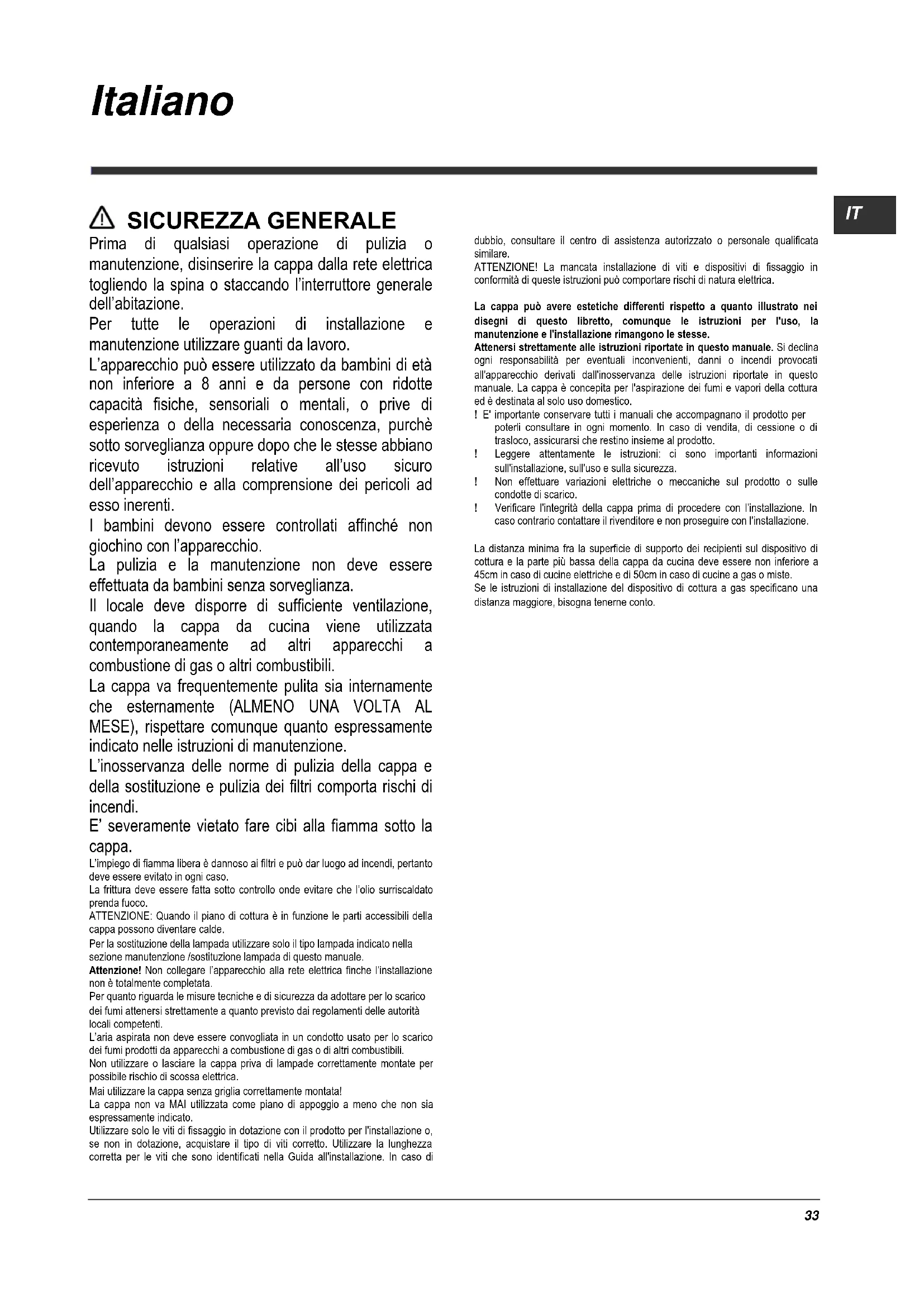SICUREZZA GENERALE Prima di qualsiasi operazione di pulizia o manutenzione, disinserire la cappa dalla rete elettrica togliendo la spina o staccando l’interruttore generale dell’abitazione. Per tutte le operazioni di installazione e manutenzione utilizzare guanti da lavoro. L’apparecchio può essere utilizzato da bambini di età non inferiore a 8 anni e da persone con ridotte capacità fisiche, sensoriali o mentali, o prive di esperienza o della necessaria conoscenza, purchè sotto sorveglianza oppure dopo che le stesse abbiano ricevuto istruzioni relative all’uso sicuro dell’apparecchio e alla comprensione dei pericoli ad esso inerenti. I bambini devono essere controllati affinché non giochino con l’apparecchio. La pulizia e la manutenzione non deve essere effettuata da bambini senza sorveglianza. Il locale deve disporre di sufficiente ventilazione, quando la cappa da cucina viene utilizzata contemporaneamente ad altri apparecchi a combustione di gas o altri combustibili. La cappa va frequentemente pulita sia internamente che esternamente (ALMENO UNA VOLTA AL MESE), rispettare comunque quanto espressamente indicato nelle istruzioni di manutenzione. L’inosservanza delle norme di pulizia della cappa e della sostituzione e pulizia dei filtri comporta rischi di incendi. E’ severamente vietato fare cibi alla fiamma sotto la cappa. L’impiego di fiamma libera è dannoso ai filtri e può dar luogo ad incendi, pertanto deve essere evitato in ogni caso. La frittura deve essere fatta sotto controllo onde evitare che l’olio surriscaldato prenda fuoco. ATTENZIONE: Quando il piano di cottura è in funzione le parti accessibili della cappa possono diventare calde. Per la sostituzione della lampada utilizzare solo il tipo lampada indicato nella sezione manutenzione /sostituzione lampada di questo manuale. Attenzione! Non collegare l’apparecchio alla rete elettrica finche l’installazione non è totalmente completata. Per quanto riguarda le misure tecniche e di sicurezza da adottare per lo scarico dei fumi attenersi strettamente a quanto previsto dai regolamenti delle autorità locali competenti. L’aria aspirata non deve essere convogliata in un condotto usato per lo scarico dei fumi prodotti da apparecchi a combustione di gas o di altri combustibili. Non utilizzare o lasciare la cappa priva di lampade correttamente montate per possibile rischio di scossa elettrica. Mai utilizzare la cappa senza griglia correttamente montata! La cappa non va MAI utilizzata come piano di appoggio a meno che non sia espressamente indicato. Utilizzare solo le viti di fissaggio in dotazione con il prodotto per l'installazione o, se non in dotazione, acquistare il tipo di viti corretto. Utilizzare la lunghezza corretta per le viti che sono identificati nella Guida all'installazione. In caso di dubbio, consultare il centro di assistenza autorizzato o personale qualificata similare. ATTENZIONE! La mancata installazione di viti e dispositivi di fissaggio in conformità di queste istruzioni può comportare rischi di natura elettrica. La cappa può avere estetiche differenti rispetto a quanto illustrato nei disegni di questo libretto, comunque le istruzioni per l'uso, la manutenzione e l'installazione rimangono le stesse. Attenersi strettamente alle istruzioni riportate in questo manuale. Si declina ogni responsabilità per eventuali inconvenienti, danni o incendi provocati all'apparecchio derivati dall'inosservanza delle istruzioni riportate in questo manuale. La cappa è concepita per l'aspirazione dei fumi e vapori della cottura ed è destinata al solo uso domestico. ! E' importante conservare tutti i manuali che accompagnano il prodotto per poterli consultare in ogni momento. In caso di vendita, di cessione o di trasloco, assicurarsi che restino insieme al prodotto. ! Leggere attentamente le istruzioni: ci sono importanti informazioni sull'installazione, sull'uso e sulla sicurezza. ! Non effettuare variazioni elettriche o meccaniche sul prodotto o sulle condotte di scarico. ! Verificare l'integrità della cappa prima di procedere con l’installazione. In caso contrario contattare il rivenditore e non proseguire con l'installazione. La distanza minima fra la superficie di supporto dei recipienti sul dispositivo di cottura e la parte più bassa della cappa da cucina deve essere non inferiore a 45cm in caso di cucine elettriche e di 50cm in caso di cucine a gas o miste. Se le istruzioni di installazione del dispositivo di cottura a gas specificano una distanza maggiore, bisogna tenerne conto.34 COLLEGAMENTO ELETTRICO La tensione di rete deve corrispondere alla tensione riportata sull’etichetta caratteristiche situata all’interno della cappa. Se provvista di spina allacciare la cappa ad una presa conforme alle norme vigenti posta in zona accessibile anche dopo l’installazione. Se sprovvista di spina (collegamento diretto alla rete) o la spina non è posta in zona accessibile, anche dopo installazione, applicare un interruttore bipolare a norma che assicuri la disconnessione completa della rete nelle condizioni della categoria di sovratensione III, conformemente alle regole di installazione. Attenzione! Prima di ricollegare il circuito della cappa all’alimentazione di rete e di verificarne il corretto funzionamento, controllare sempre che il cavo di rete sia stato montato correttamente. Sostituzione del cavo di alimentazione La cappa è provvista di un cavo alimentazione speciale; in caso di danneggiamento del cavo, richiederlo al servizio assistenza tecnica.