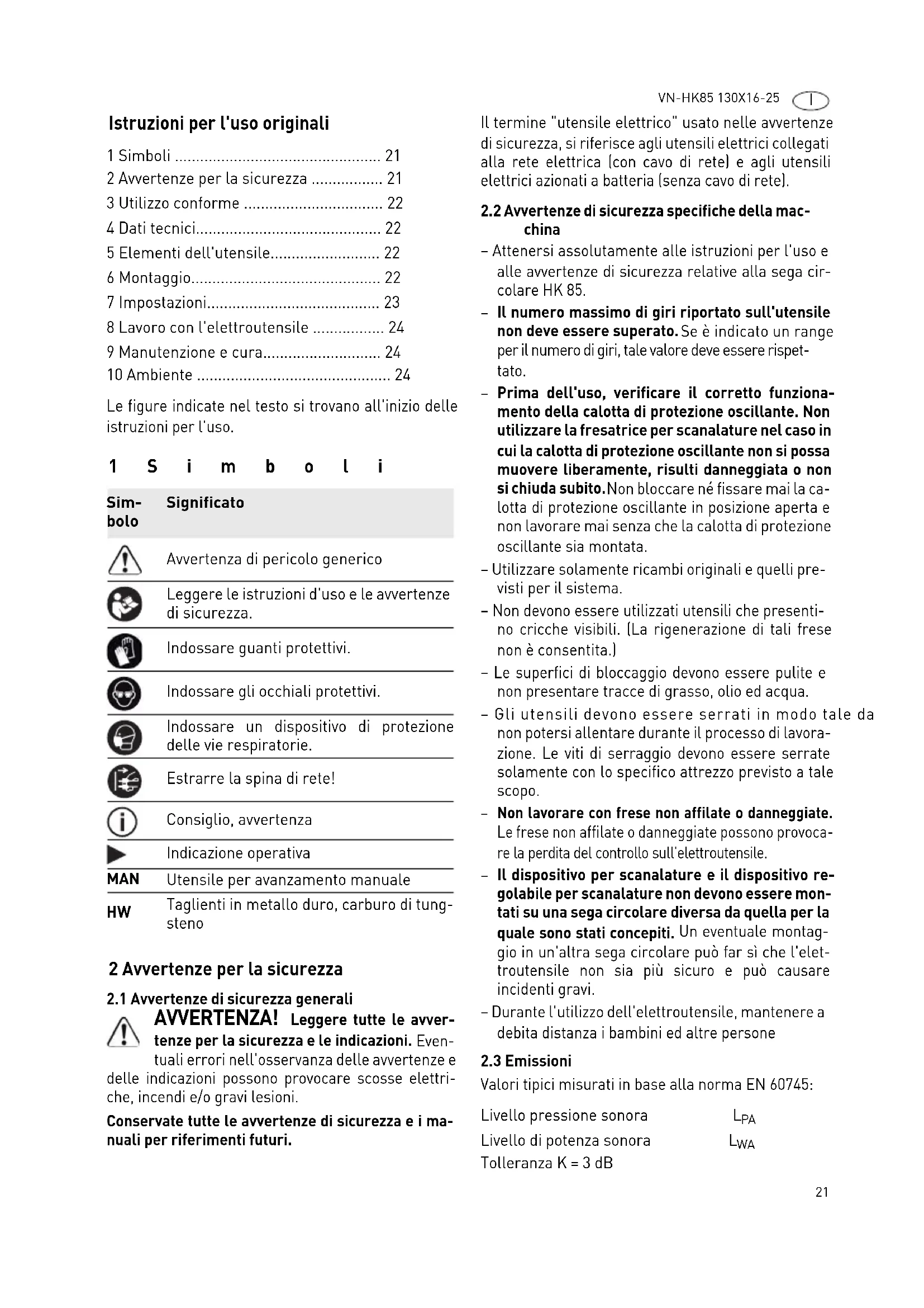 - Attenersi assolutamente alle istruzioni per l'uso e alle avventenze di sicurezza relative alla sega circolare HK 85.