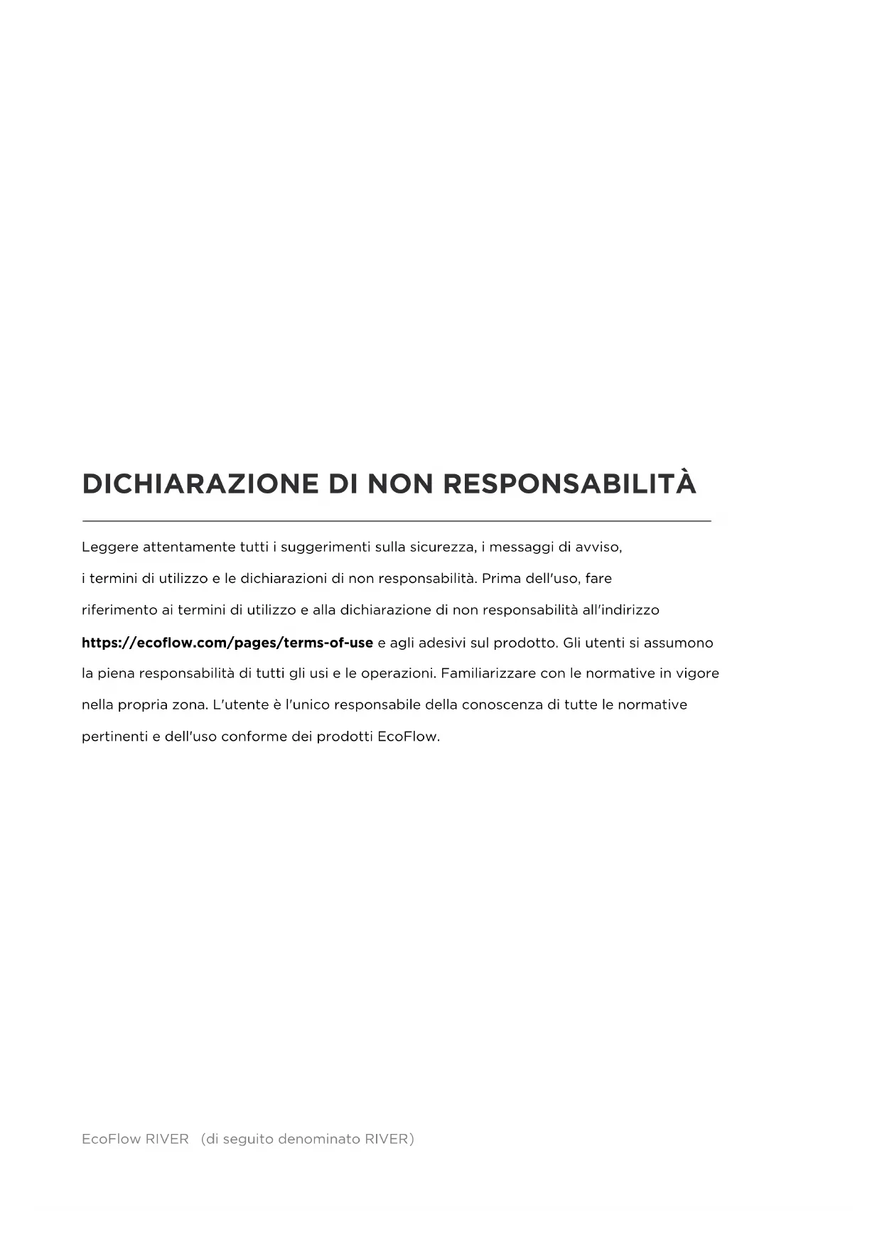 Leggere attentamente tutti i suggerimenti sulla sicurezza, i messaggi di avviso, i termini di utilizzo e le dichiarazioni di non responsabilità. Prima dell'uso, fare riferimento ai termini di utilizzo e alla dichiarazione di non responsabilità all'indirizzo https://ecoflow.com/pages/terms-of-use e agli adesivi sul prodotto. Gli utenti si assumono la piena responsabilità di tutti gli usi e le operazioni. Familiarizzare con le normative in vigore nella propria zona. L'utente è l'unico responsabile della conoscenza di tutte le normative pertinenti e dell'uso conforme dei prodotti EcoFlow.