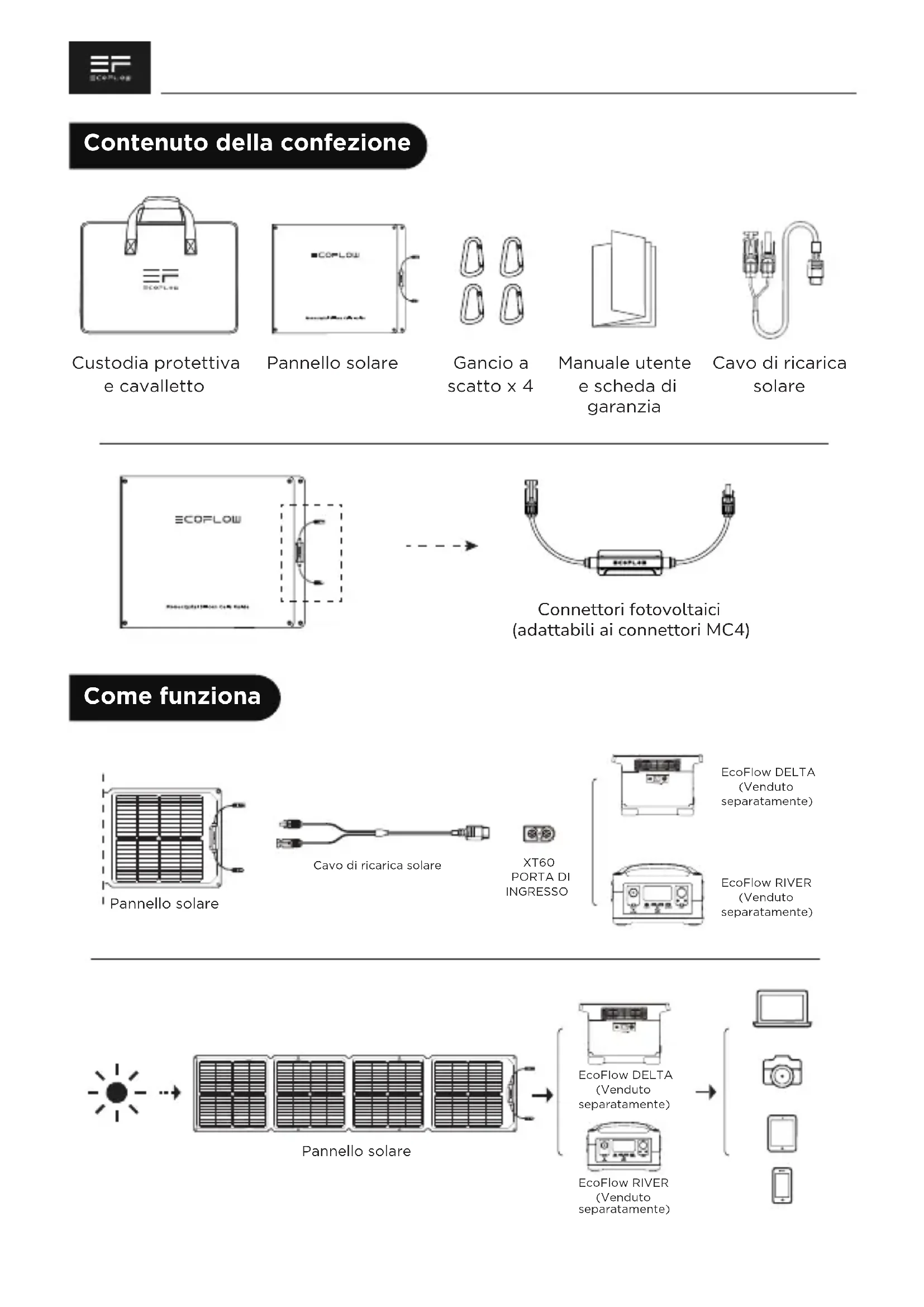 ) in condizioni AM1.5 con una temperatura del pannello di 25°C (77°F) in condizioni di prova. L’uscita di potenza ha valori nominali prossimi a quelli osservati normalmente a mezzogiorno durante l’inverno.) Cosa si deve sapere sulla temperatura di esercizio, la conservazione e l’uso del pannello solare da 110W? La temperatura di esercizio del pannello solare è 20°C–85°C (-4°F–185°F). Il pannello deve essere ripiegato nella sua forma originale e conservato nella sua custodia protettiva (cavalletto), che fornisce una protezione suciente per il prodotto. Per prolungare la vita utile del pannello, assicurarsi che il prodotto non sia esposto a forze/impatti esterni quando non viene utilizzato. Il pannello solare non deve essere lasciato cadere, non deve essere forato, piegato e non ci si deve sedere su di esso. Queste azioni potrebbero rompere la cella e rendere il pannello inutilizzabile. Danni di questo tipo non saranno coperti dalla garanzia gratuita.È possibile utilizzare centrali elettriche di un marchio diverso da EcoFlow con il pannello solare da 110W? Sì, ma solo alcuni tipi. La centrale elettrica utilizzata deve essere compatibile con gli standard MC4 per funzionare correttamente. Inoltre, altre marche di centrali elettriche potrebbero non orire gli stessi livelli di compatibilità delle centrali elettriche a marchio EcoFlow, potrebbero avere potenze nominali inferiori e potrebbero non orire gli stessi livelli di prestazioni. È possibile collegare in serie pannelli solari da 110W con pannelli solari di altre dimensioni? Sì, ma non è consigliato. Anche se la tensione dei due pannelli è identica, le correnti nominali non lo sono. Ciò significa che quando i pannelli sono collegati in serie, la corrente sarà limitata a quella del pannello solare inferiore, pertanto il pannello solare da 110W non può erogare la massima energia con uno scenario risultante di 1+1<2. Acquistare pannelli delle stesse dimensioni se si intende collegare più pannelli in serie. È possibile collegare i pannelli solari da 110W in parallelo? Sì, ma non è consigliato. I collegamenti in parallelo raddoppieranno la corrente totale della potenza in ingresso. I pannelli solari da 110W possono essere collegati in parallelo, ma la corrente può superare il limite di corrente di ingresso della centrale elettrica. Utilizzare solo due pannelli da 110W per il collegamento in parallelo. Se si desidera collegare più di due pannelli da 110W in parallelo, assicurarsi che la corrente di ingresso solare massima della centrale elettrica sia superiore a 20A.Specifiche tecniche Pannello solare da 110W Informazioni generali Potenza nominale: 110 W(+/-5 W)* Tensione a circuito aperto: 21,8 V Tensione di esercizio: 18,4 V Corrente di cortocircuito: 6,5 A Corrente di esercizio: 6,0 A Efficienza: 22,8% Tipo di cella: Silicio monocristallino Pannello solare: Circa 8,8 lbs (4 KG) Dimensioni da aperto: 16,5*70,3*1,0 in (42,0*178,5*2,5 cm) Dimensioni da ripiegato: 16,5*18,9*1,0 in (42,0*48*2,5 cm) Garanzia: 12 mesi *Condizioni di test standard: 1000 W/m