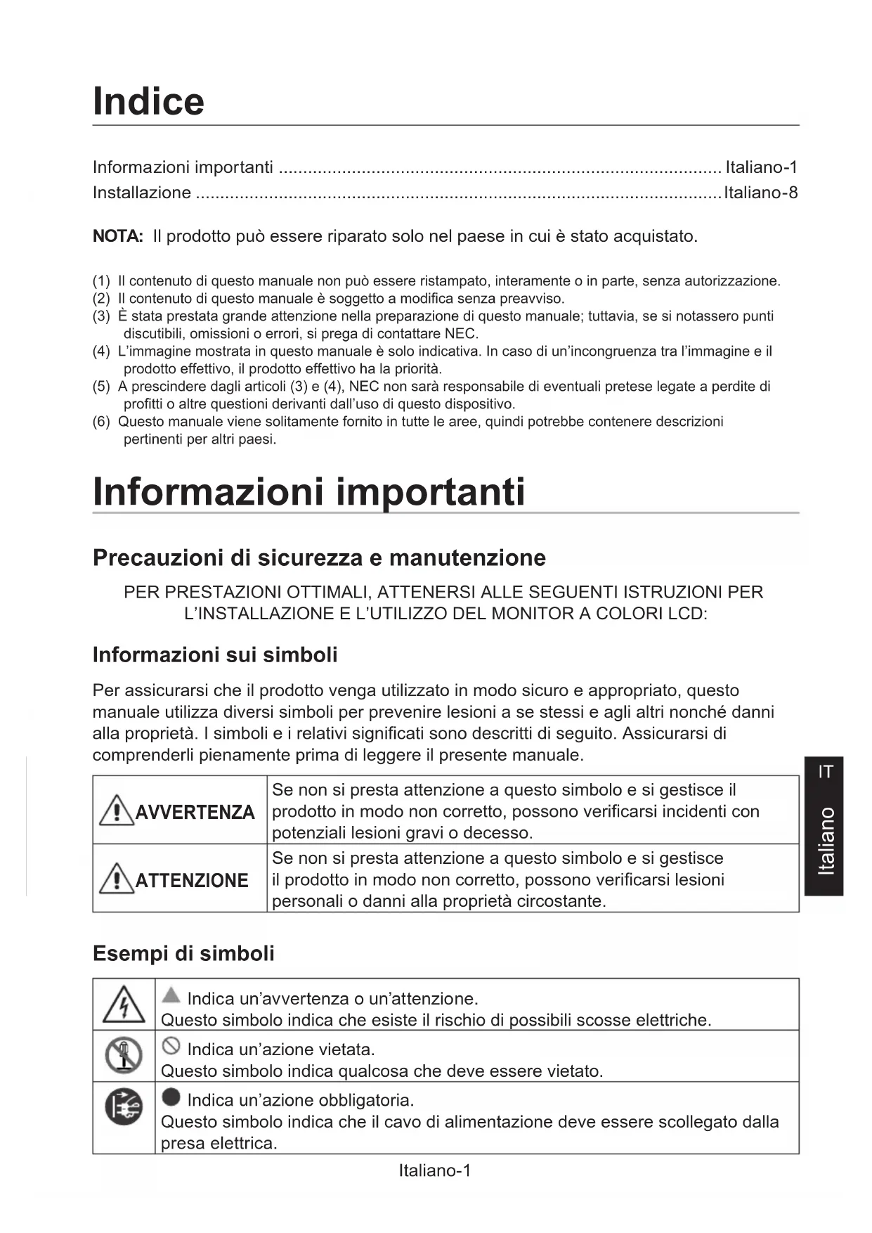 (3) É stata prestata grande attenzione nella preparazione di questo manuale; tuttavia, se si notassero puniti discutibili, omissioni o errorsi, si prega di contattare NEC.