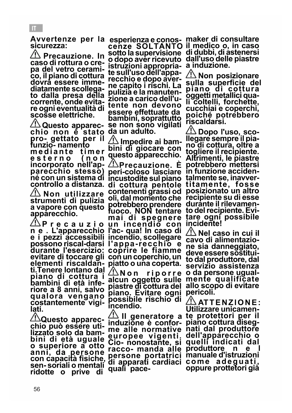 Avvertenze per la sicurezza: Precauzione. In caso di rottura o cre- pa del vetro cerami- co, il piano di cottura dovrà essere imme- diatamente scollega- to dalla presa della corrente, onde evita- re ogni eventualità di scosse elettriche. Questo apparec- chio non è stato pro- gettato per il funzio- namento mediante timer esterno (non incorporato nell'ap- parecchio stesso) né con un sistema di controllo a distanza. Non utilizzare strumenti di pulizia a vapore con questo apparecchio. P r e c a u z i o n e . L'apparecchio e i pezzi accessibili possono riscal-darsi durante l'esercizio: evitare di toccare gli elementi riscaldan- ti.Tenere lontano dal piano di cottura i bambini di età infe- riore a 8 anni, salvo qualora vengano costantemente vigi- lati. Questo apparec- chio può essere uti- lizzato solo da bam- bini di età uguale o superiore a otto anni, da persone con capacità siche, sen- soriali o mentali ridotte o prive di esperienza e conos- cenze SOLTANTO sotto la supervisione o dopo aver ricevuto istruzioni appropria- te sull'uso dell'appa- recchio e dopo aver- ne capito i rischi. La pulizia e la manuten- zione a carico dell'u- tente non devono essere eettuate da bambini, soprattutto se non sono vigilati da un adulto. Impedire ai bam- bini di giocare con questo apparecchio. Precauzione. È peri-coloso lasciare incustodite sul piano di cottura pentole contenenti grassi od oli, dal momento che potrebbero prendere fuoco. NON tentare mai di spegnere un incendio con l'ac- qua! In caso di incendio, scollegare l'appa-recchio e coprire le fiamme con un coperchio, un piatto o una coperta. Non riporre alcun oggetto sulle piastre di cottura del piano. Evitare ogni possibile rischio di incendio. Il generatore a induzione è confor- me alle normative europee vigenti. Cio- nonostante, si racco- manda alle persone portatrici di apparati cardiaci quali pace- maker di consultare il medico o, in caso di dubbi, di astenersi dall'uso delle piastre a induzione. Non posizionare sulla supercie del piano di cottura oggetti metallici qua- li coltelli, forchette, cucchiai e coperchi, poiché potrebbero riscaldarsi. Dopo l'uso, sco- llegare sempre il pia- no di cottura, oltre a togliere il recipiente. Altrimenti, le piastre potrebbero mettersi in funzione acciden- talmente se, inavver- titamente, fosse posizionato un altro recipiente su di esse durante il rilevamen- to del recipiente. Evi- tare ogni possibile incidente! Nel caso in cui il cavo di alimentazio- ne sia danneggiato, deve essere sostitui- to dal produttore, dal servizio assistenza o da persone ugual- mente qualificate allo scopo di evitare pericoli. AT T E N Z I O N E : Utilizzare unicamen- te protettori per il piano cottura diseg- nati dal produttore dell'apparecchio o quelli indicati dal produttore n e l manuale d'istruzioni come adeguati, oppure prottetori giàIT