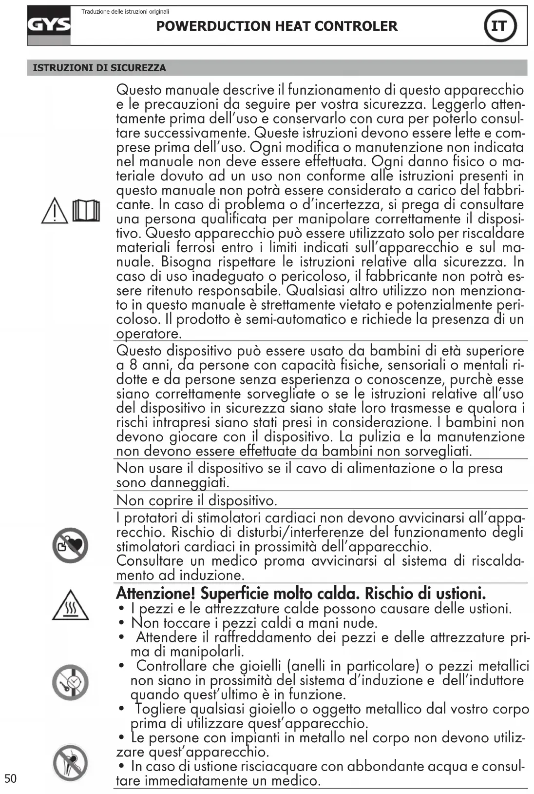 Questo manuale descrive il funzionamento di questo apparecchio e le precauzioni da seguire per vostra sicurezza. Leggerlo atten- tamente prima dell’uso e conservarlo con cura per poterlo consul- tare successivamente. Queste istruzioni devono essere lette e com- prese prima dell’uso. Ogni modifica o manutenzione non indicata nel manuale non deve essere effettuata. Ogni danno fisico o ma- teriale dovuto ad un uso non conforme alle istruzioni presenti in questo manuale non potrà essere considerato a carico del fabbri- cante. In caso di problema o d’incertezza, si prega di consultare una persona qualificata per manipolare correttamente il disposi- tivo. Questo apparecchio può essere utilizzato solo per riscaldare materiali ferrosi entro i limiti indicati sull’apparecchio e sul ma- nuale. Bisogna rispettare le istruzioni relative alla sicurezza. In caso di uso inadeguato o pericoloso, il fabbricante non potrà es- sere ritenuto responsabile. Qualsiasi altro utilizzo non menziona- to in questo manuale è strettamente vietato e potenzialmente peri- coloso. Il prodotto è semi-automatico e richiede la presenza di un operatore. Questo dispositivo può essere usato da bambini di età superiore a 8 anni, da persone con capacità fisiche, sensoriali o mentali ri- dotte e da persone senza esperienza o conoscenze, purchè esse siano correttamente sorvegliate o se le istruzioni relative all’uso del dispositivo in sicurezza siano state loro trasmesse e qualora i rischi intrapresi siano stati presi in considerazione. I bambini non devono giocare con il dispositivo. La pulizia e la manutenzione non devono essere effettuate da bambini non sorvegliati. Non usare il dispositivo se il cavo di alimentazione o la presa sono danneggiati. Non coprire il dispositivo. I protatori di stimolatori cardiaci non devono avvicinarsi all’appa- recchio. Rischio di disturbi/interferenze del funzionamento degli stimolatori cardiaci in prossimità dell’apparecchio. Consultare un medico proma avvicinarsi al sistema di riscalda- mento ad induzione. Attenzione! Supercie molto calda. Rischio di ustioni.