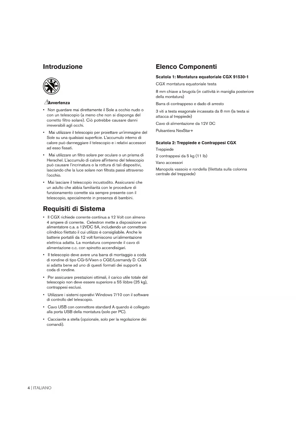 completamentodegli aggiornamenti. Appendice B: Cura e Manutenzione La montatura CGX è solida e durerà molti anni se conserva- ta correttamente. Conservazione Anche se la montatura e l'elettronica sono progettate per uso esterno, non è necessario conservare la montatura all'esterno a meno che non sia riparata da un osservatorio o strutture di protezione (quali, ad esempio, il garage). Condizioni estreme di temperatura o umidità possono eventualmente usurare l'elettronica, la lubrificazione meccanica e la qualità di finitura della montatura. Conservare in luogo al riparo dal sole. Conservare in un luogo asciutto.24 | ITALIANO AVVERTENZA SOLARE: Non tentare mai di osservare il sole attraverso un telescopio. HAI BISOGNO DI ASSISTENZA?? Contatta il supporto tecnico Celestron celestron.com/pages/technical-support ©2024 Celestron. Celetron e Symbol sono marchi di Celestron, LLC. • Tutti i diritti riservati. • Celestron.com US: 2835 Columbia Street, Torrance, CA 90503 Stati Uniti UK: Unit 2 Transigo, Gables Way, Thatcham RG19 4JZ, United Kingdom Questo prodotto è progettato per essere utilizzato da persone di età pari o superiore ai 14 anni. Le fotografie presenti su questa confezione hanno puro scopo decorativo e non rappresentano ciò che è osservabile con il prodotto. www.celestron.com/pages/warranty Prodotto in Cina | 09-24 Nota FCC: La presente apparecchiatura è stata testata ed è risultata conforme ai limiti imposti per i dispositivi digitali di Classe B, ai sensi della Parte 15 delle Norme FCC. Tali limiti sono stati ideati per fornire un’adeguata protezione nei confronti di interferenze dannose in installazioni residenziali. La presente apparecchiatura genera, utilizza e può irradiare energia in radio frequenza e, se non installata e utilizzata conformemente alle istruzioni, può causare interferenze dannose alle radiocomunicazioni. Tuttavia, non esiste alcuna garanzia che l’interferenza non si verifichi in una particolare installazione. Nel caso in cui la presente apparecchiatura causi interferenze dannose alla ricezione radio o televisiva, il che potrebbe essere determinato dall’accensione e dallo spegnimento dell’apparecchiatura, l’utente è incoraggiato a tentare di correggere l’interferenza mediante una o più delle misure seguenti: