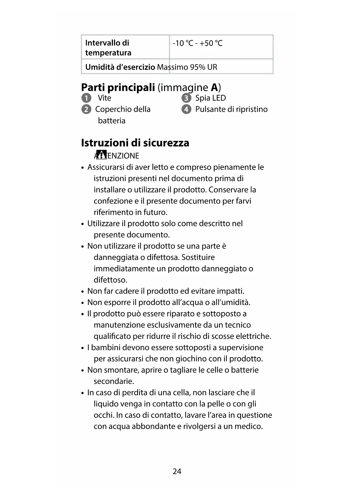 - In caso di perdita di una cella, non lasciare che il liquido venga in contatto con la pelle o con gli occhi. In caso di contatto, lavare l’area in questione con acqua abbondante e rivolgersi a un medico.25