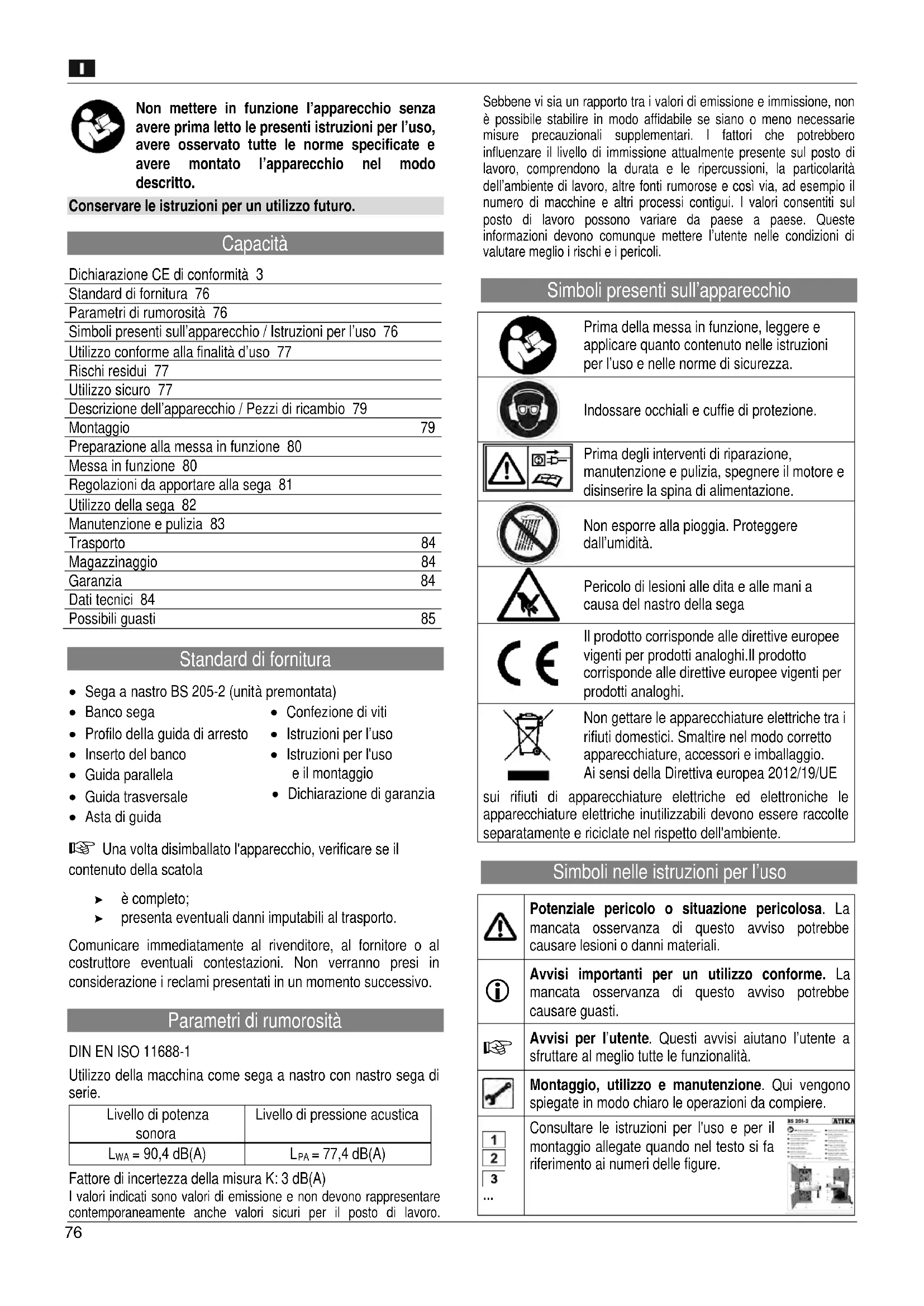 Il costruttore declina inoltre anni responsabilità per i dati di qualiasi gener che dovessero risultare da modifiche alla sega apporte in proprio dall'utente. - La sega deve essere preparata, utilizzata e sottoposta a manutenzione solo da parte di persone che ne abbiano acquisito familiarità e che siano a conoscenza dei rischi connessi. Gli interventi di riparazione devono essere eseguiti solo dai nostri tecnici oppure dai centri di assistenza da moi consigliati.